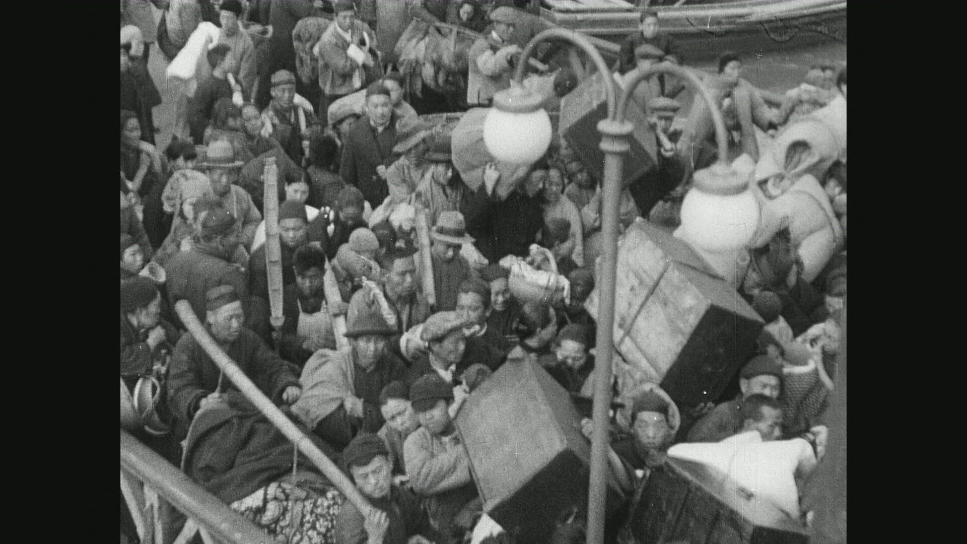 > The arrest and conveyance of a Chinese man in Chinatown, watched by a crowd of onlookers.