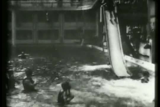 A toboggan slide in San Francisco which bathers use, some sitting, others lying down, head first or