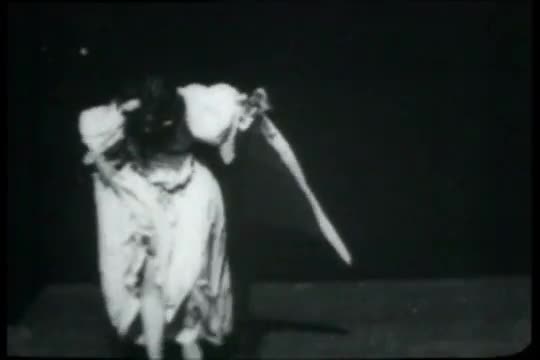 A young, dark-haired woman performs a dance inspired by George du Maurier's character Trilby, in an early modern dance style.