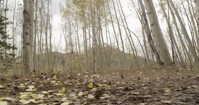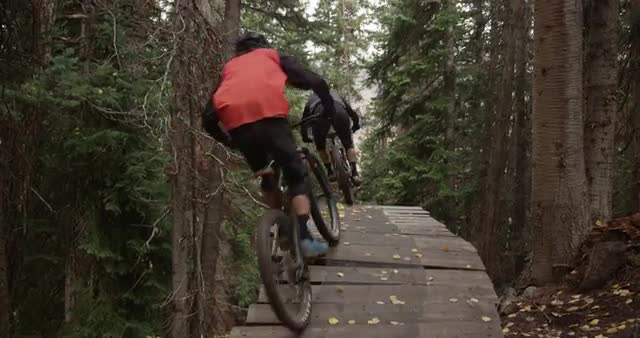 Slider shot of a mountain biker riding a dirt trail near a National Forest.