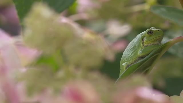 662742 - Tree frog in hydrangea, slow right pan
