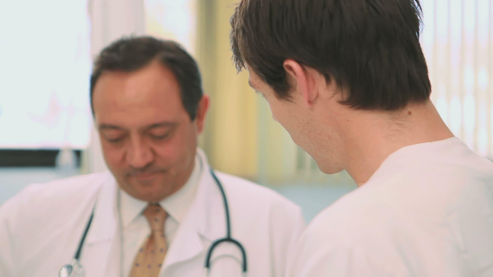 Doctor and a male nurse talking in a hospital room