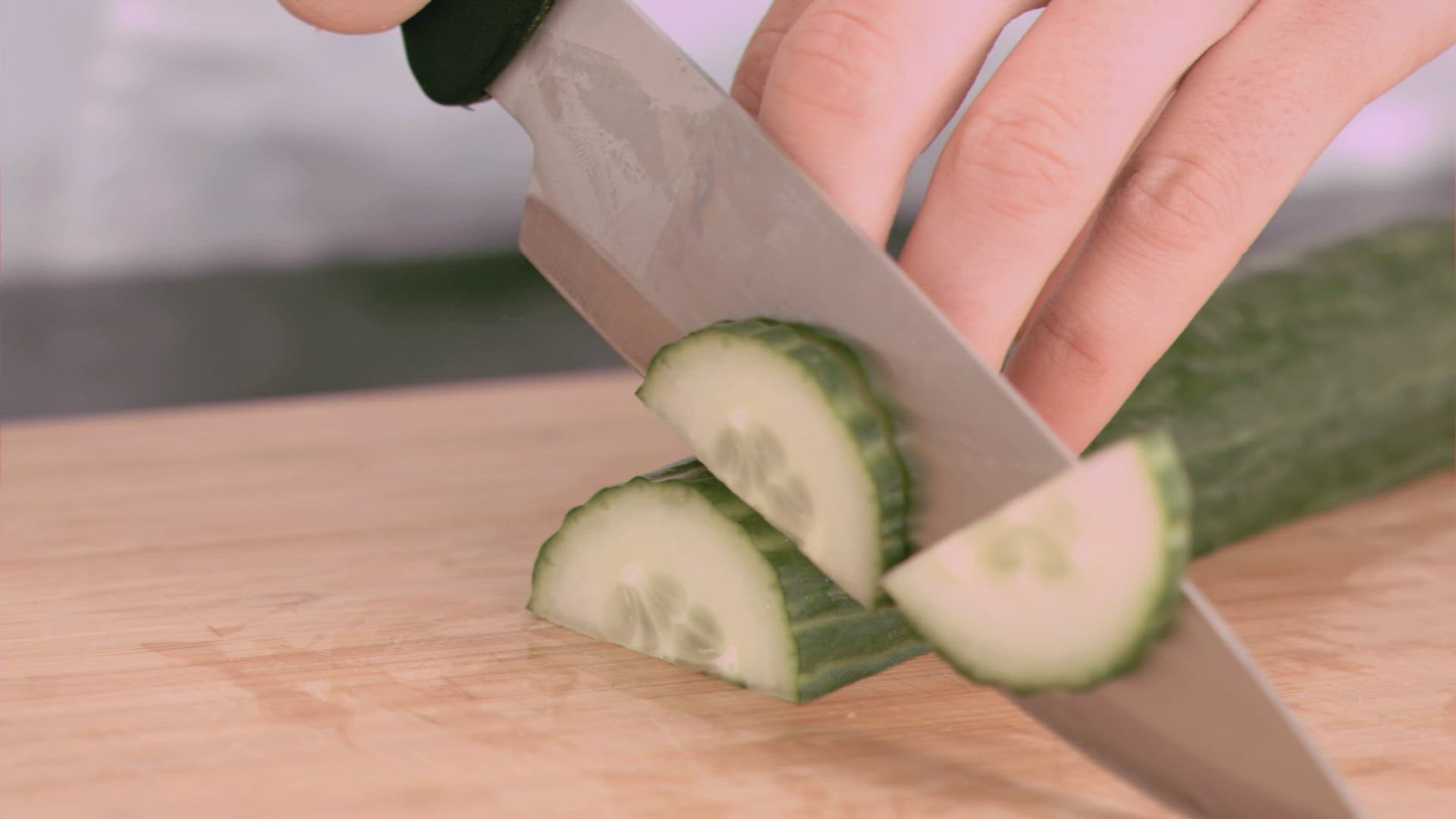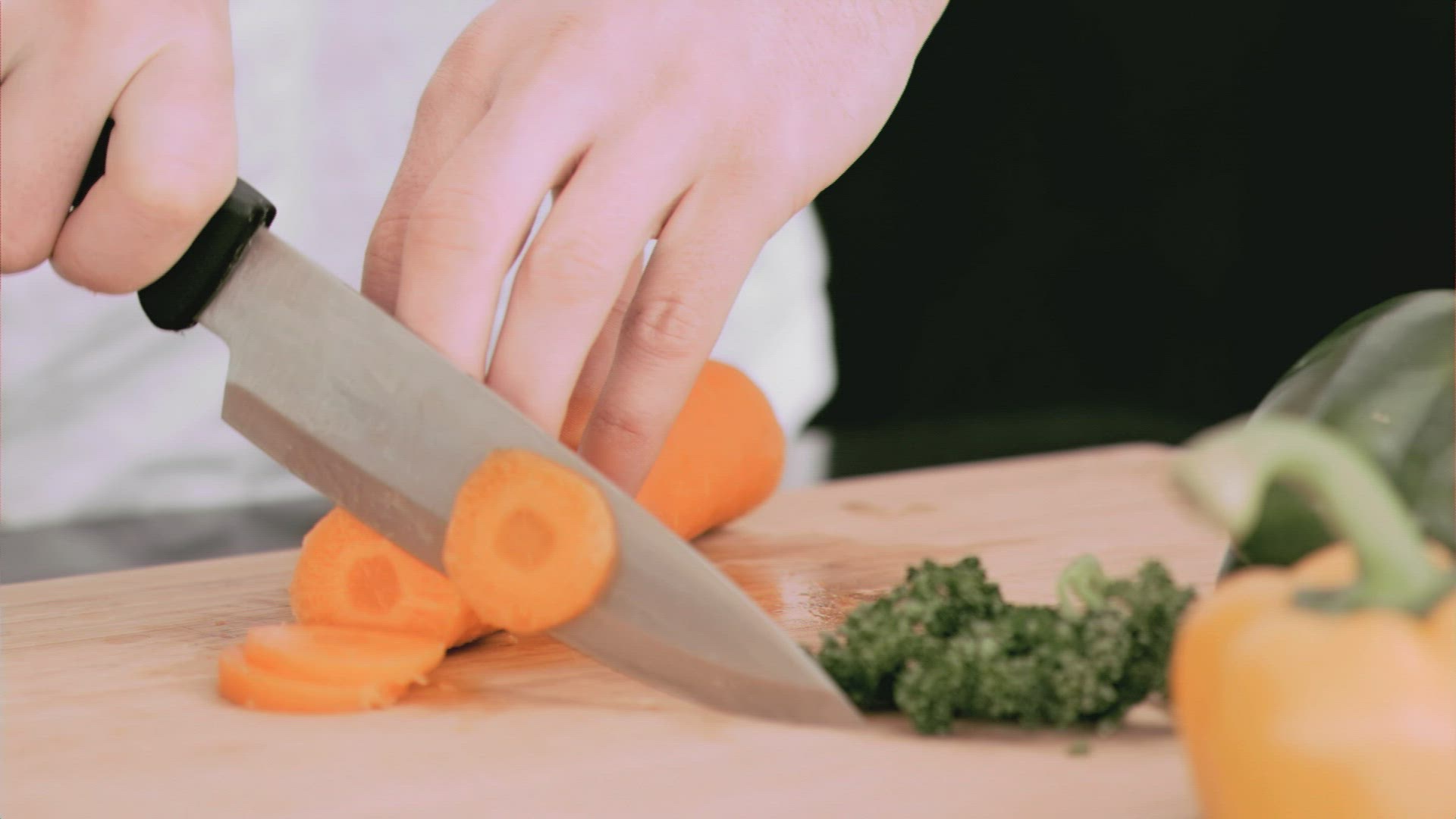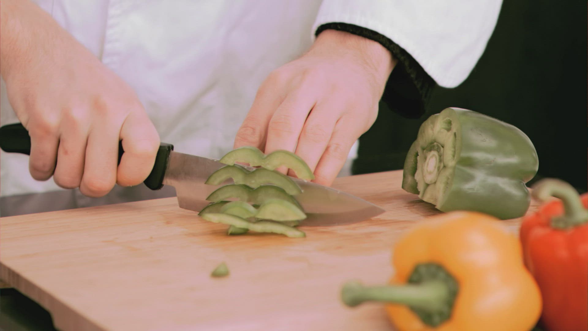 Woman cutting a bell pepper in slow motion in the kitchen
