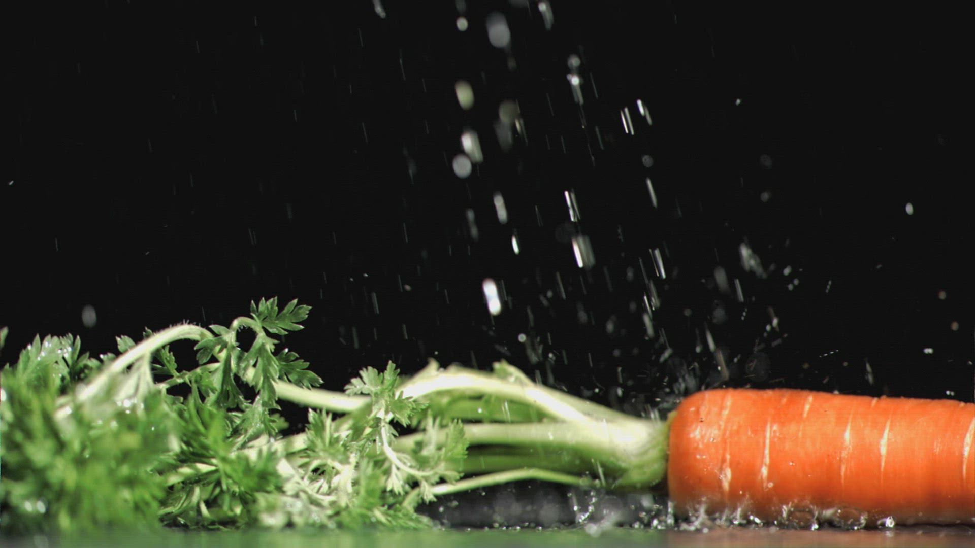 Tasty carrots in super slow motion receiving raindrops against a white background