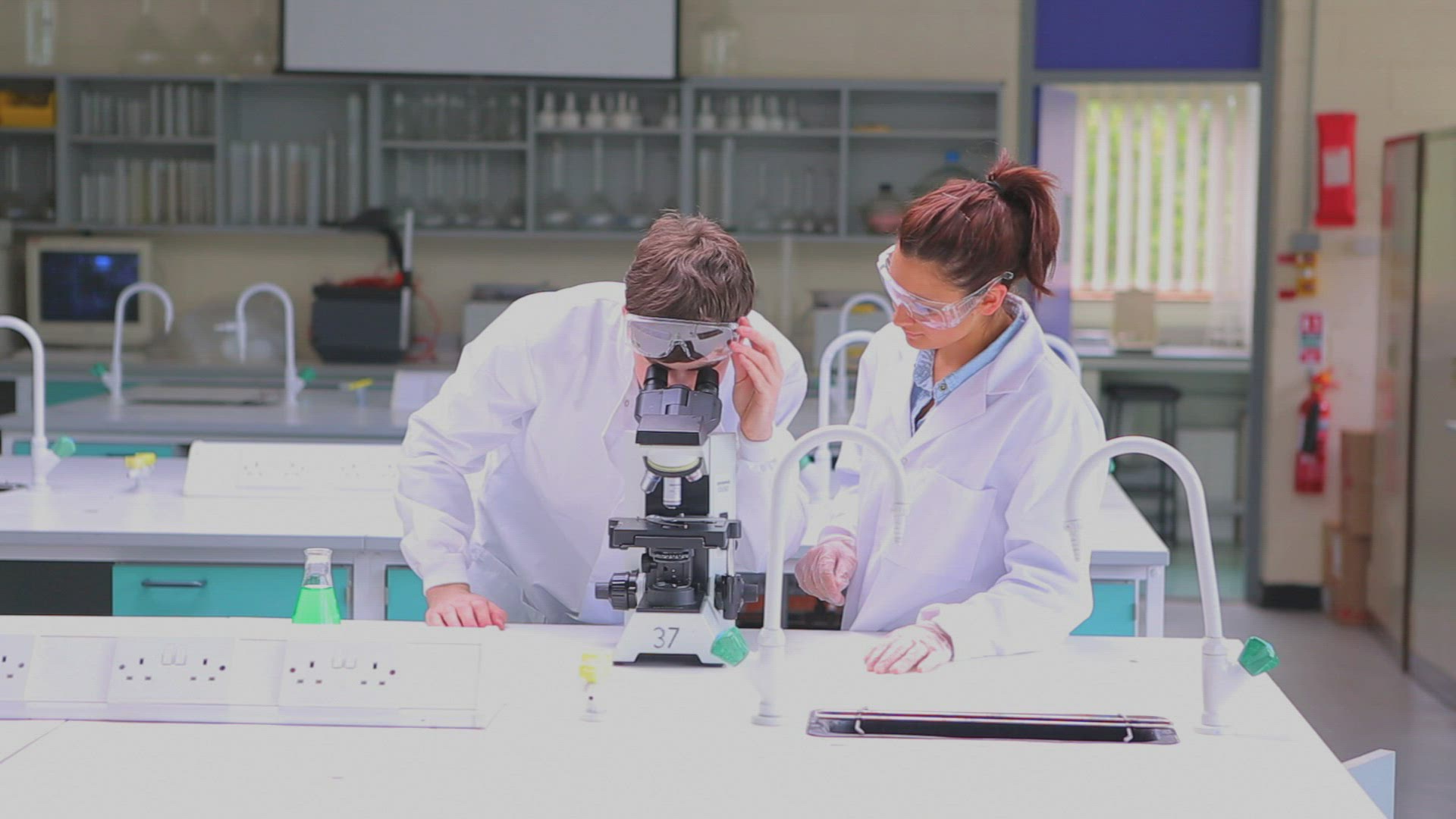 Group of three scientists working in a laboratory with lab coat and microscope