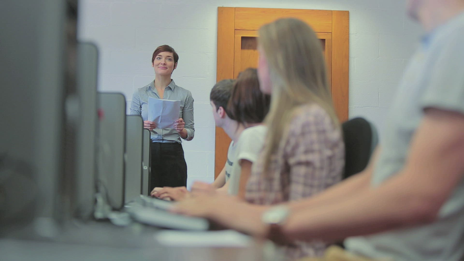 Students sitting at the computer and working on it while the teacher explain something in the computer class