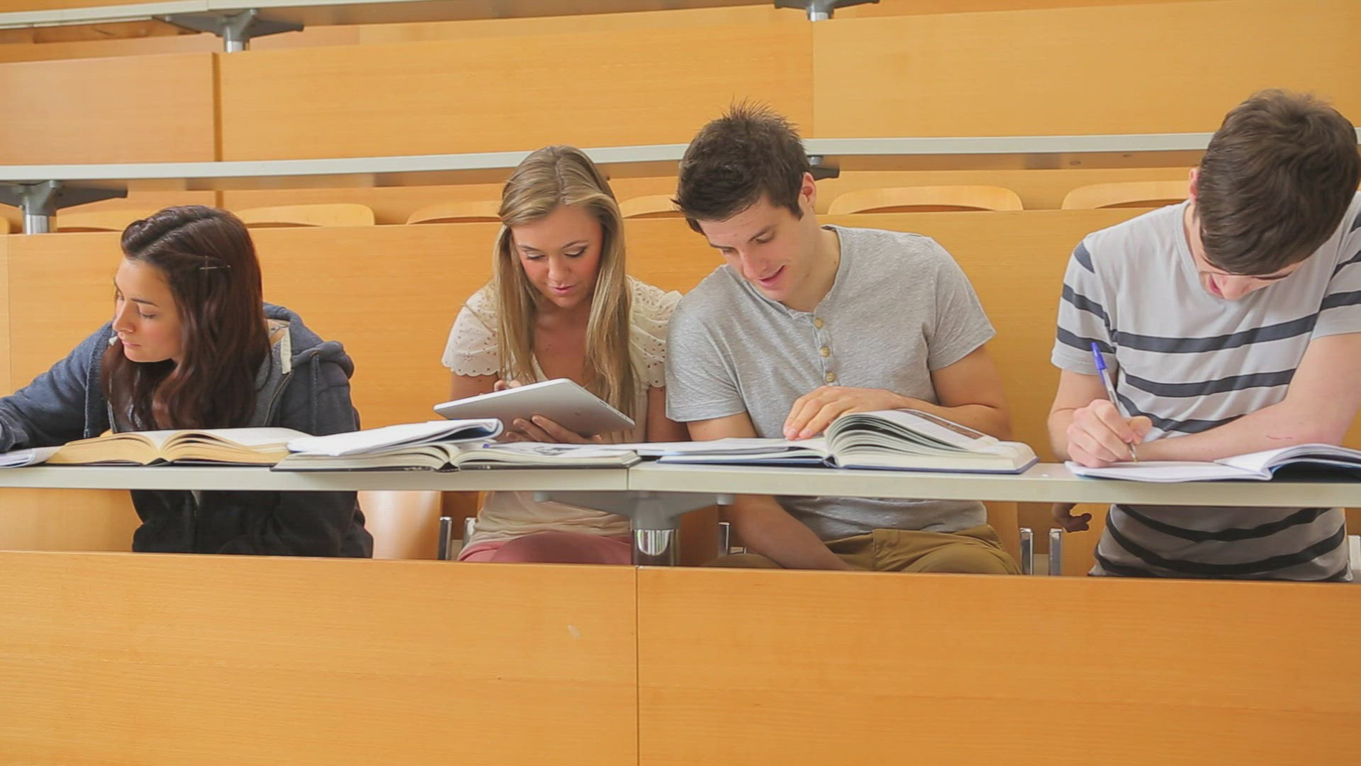Man sitting at the lecture hall holding a tablet computer while the teacher snatched it to him