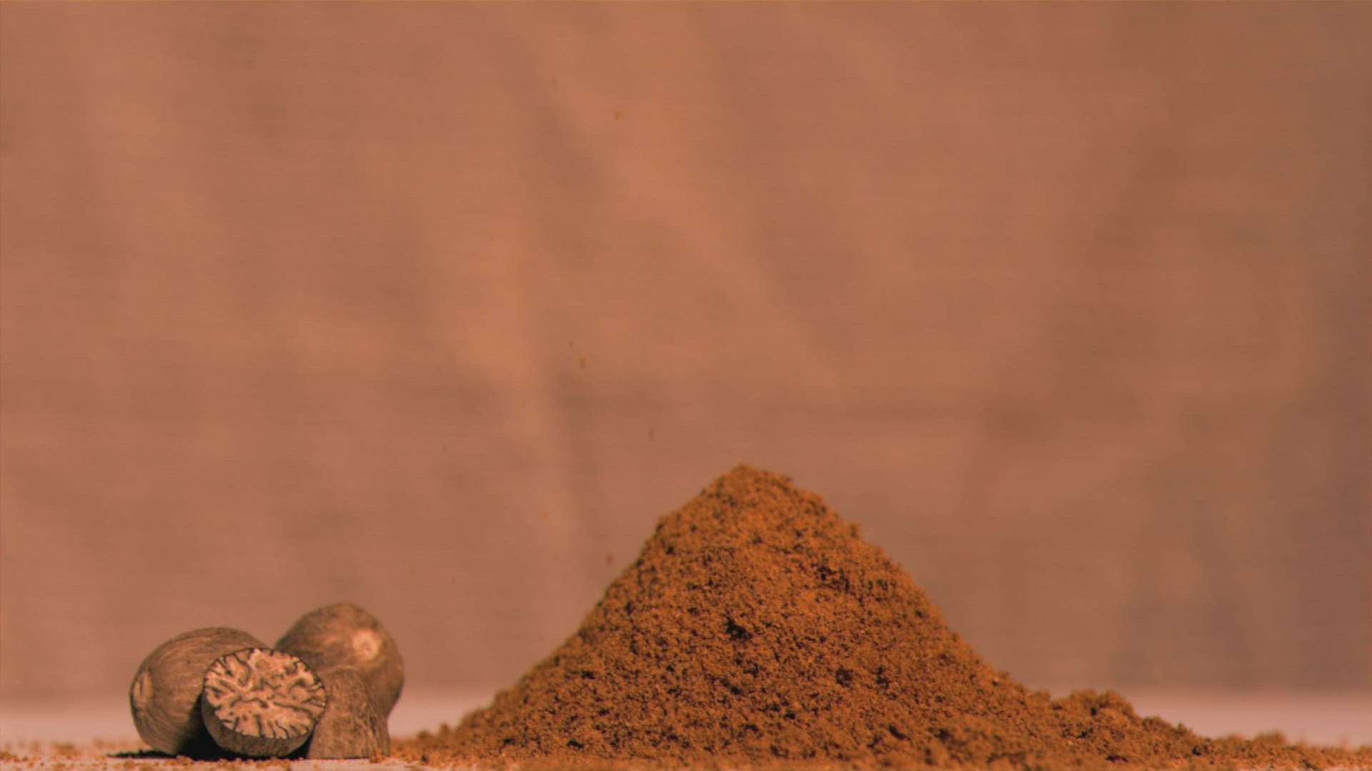 Super slow motion of nutmeg powder falling against brown background
