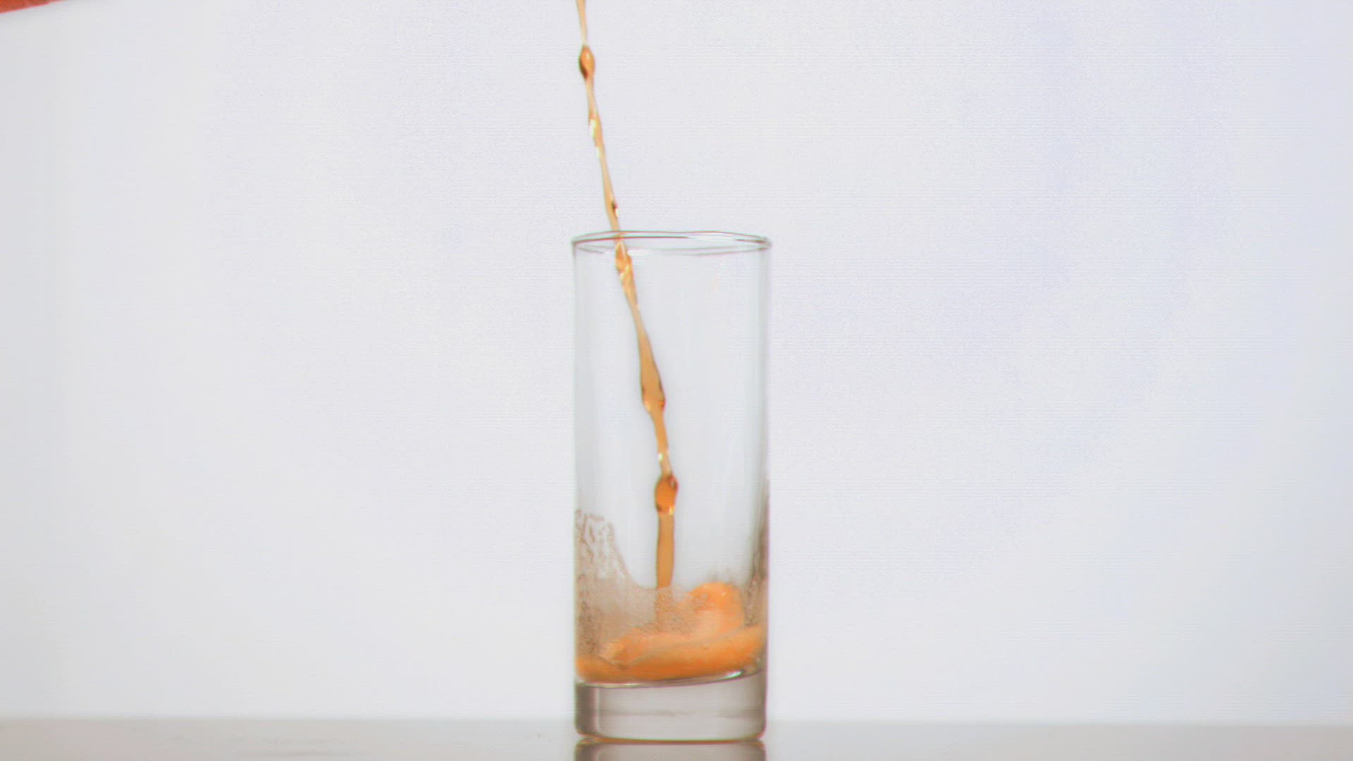 Fizzy orange juice poured in super slow motion in a glass against white background
