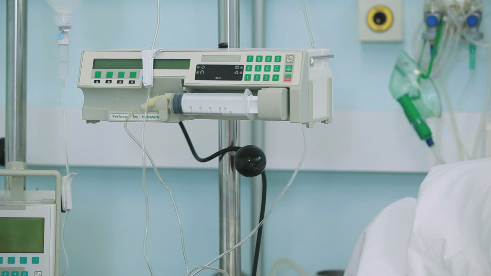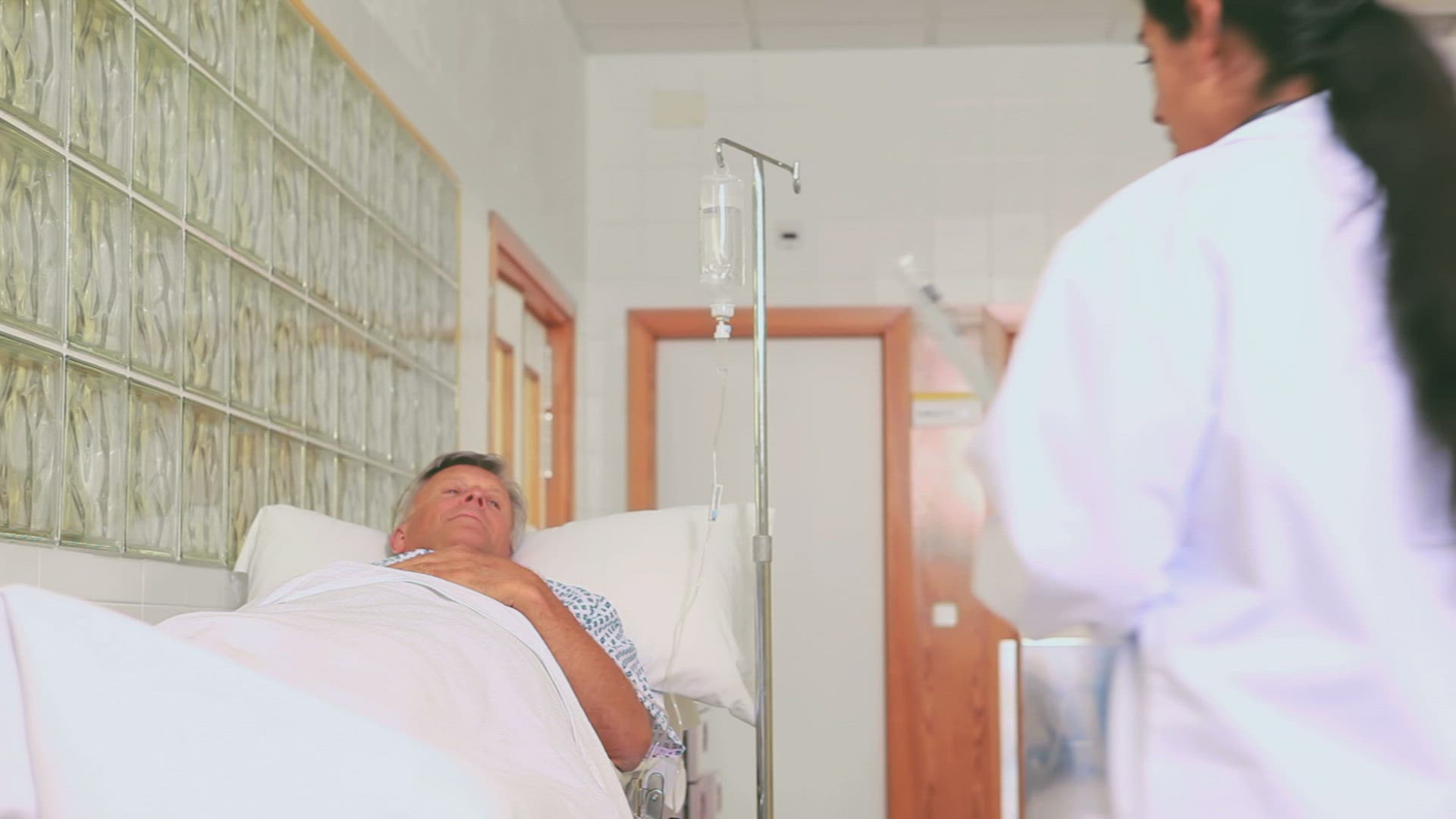 Patient walking while holding a drip stand in hospital ward