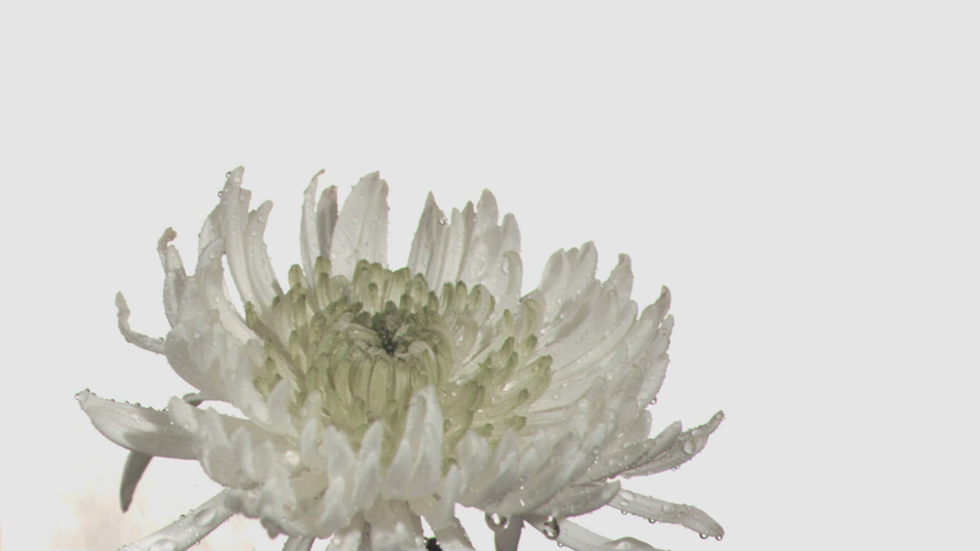 Rain falling in super slow motion on white Chrysanthemum against white background