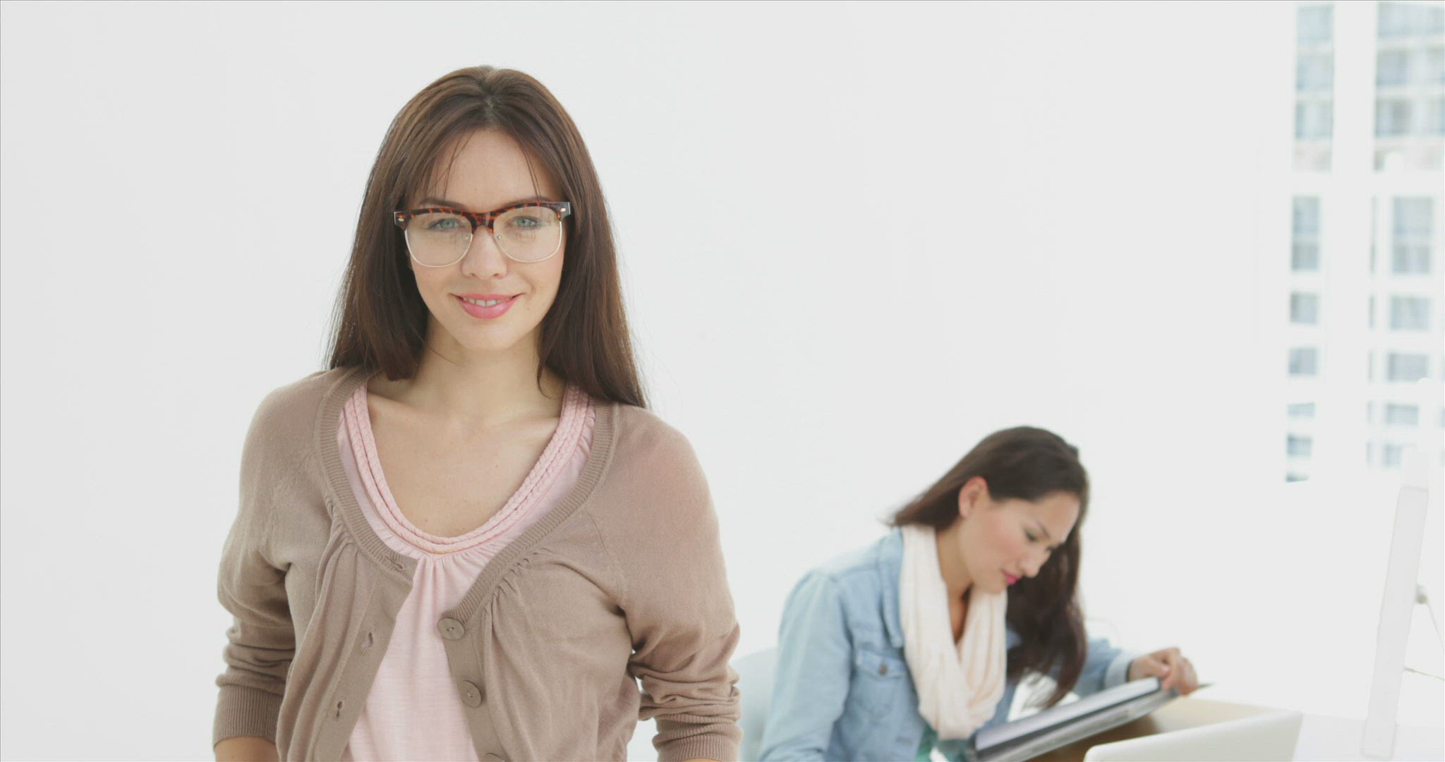 Creative businesswoman smiling at camera with colleague behind her