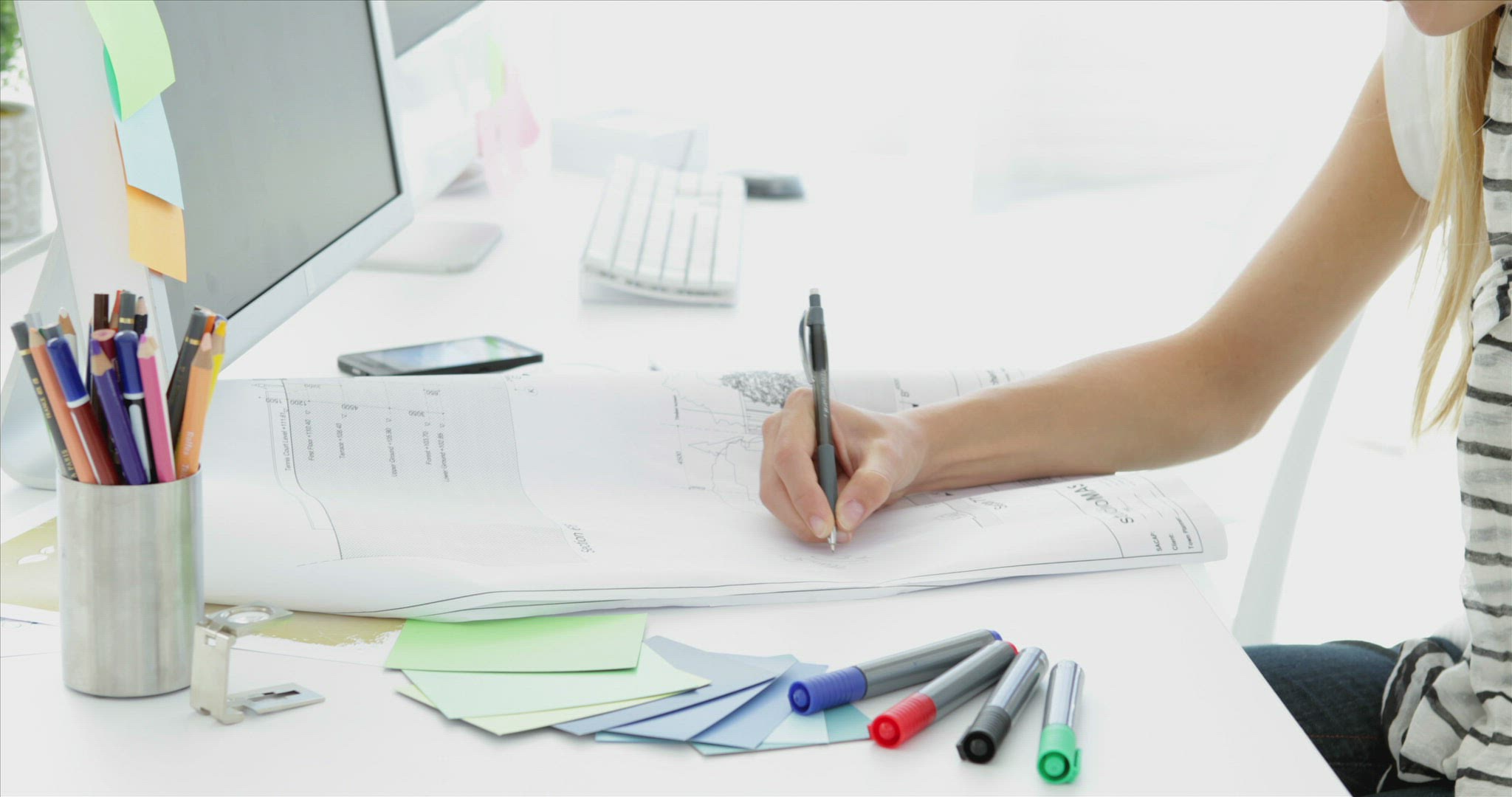 Focused blonde creative designer being helped by colleague