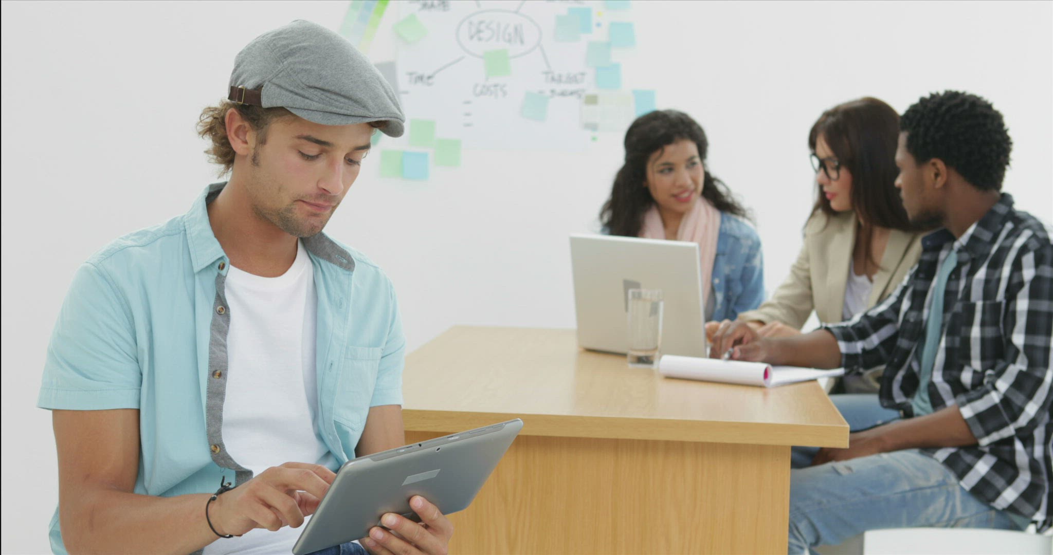 Smiling man uses tablet while colleagues work behind him