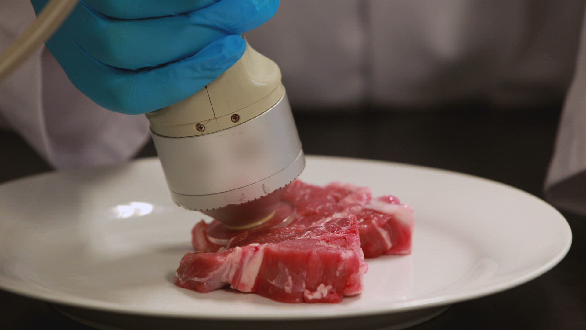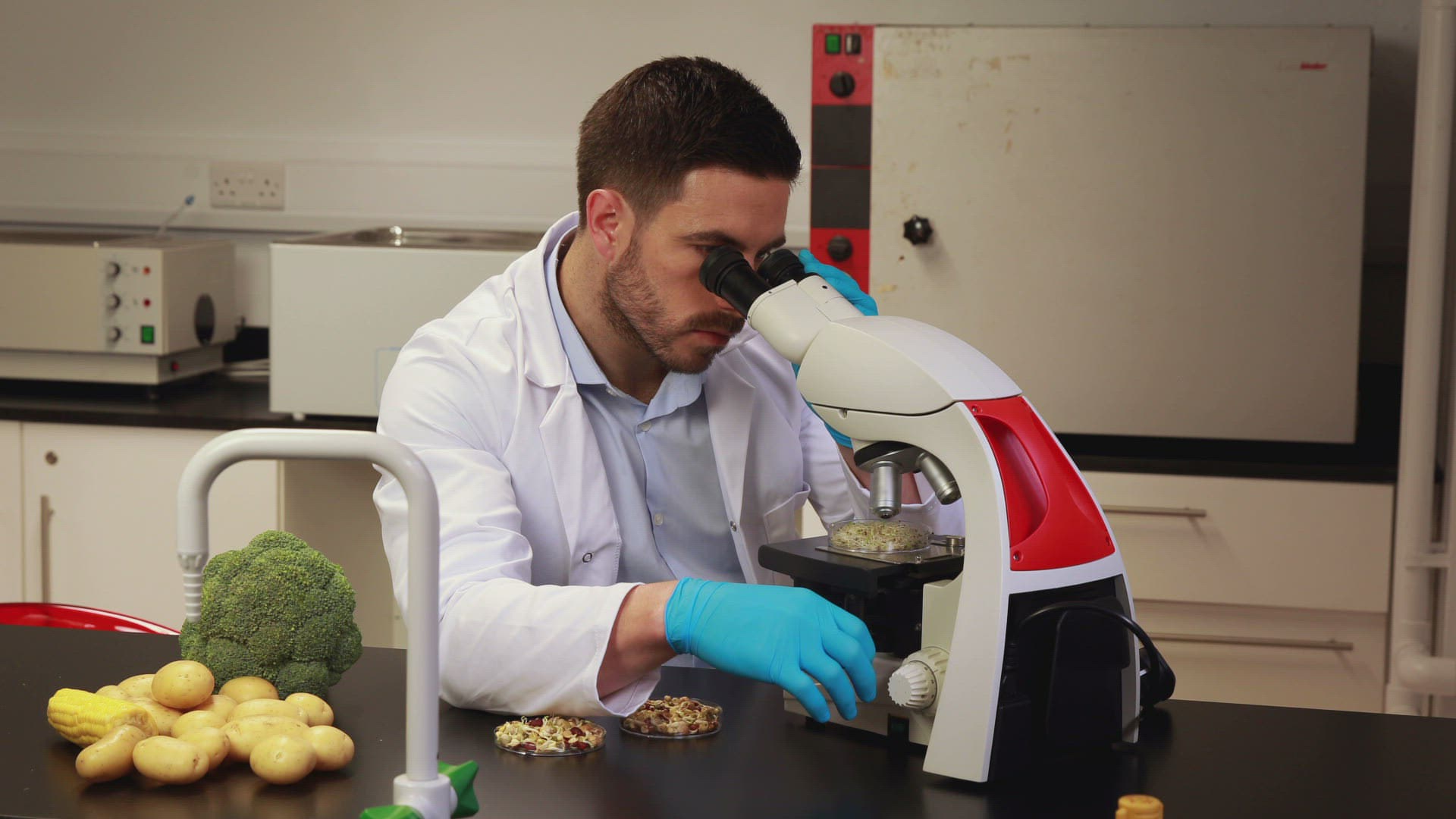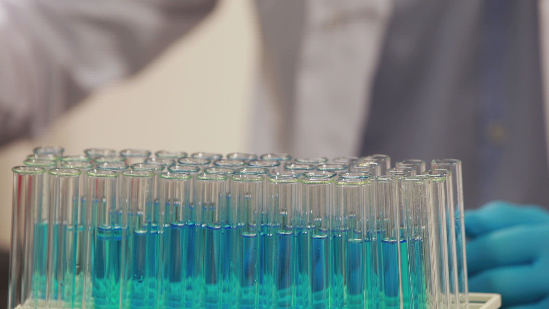 Scientist looking at beaker of chemical in the laboratory