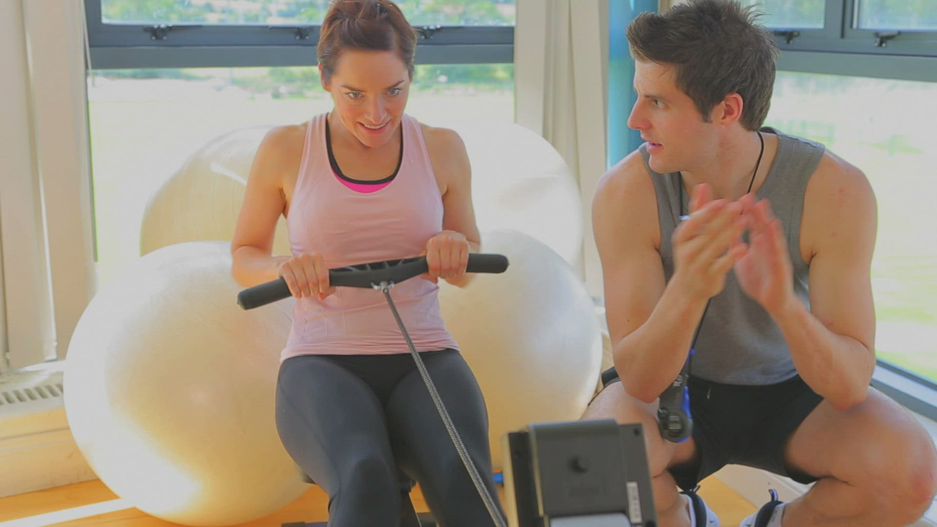 Smiling physiotherapist timing elderly patient with knee bent