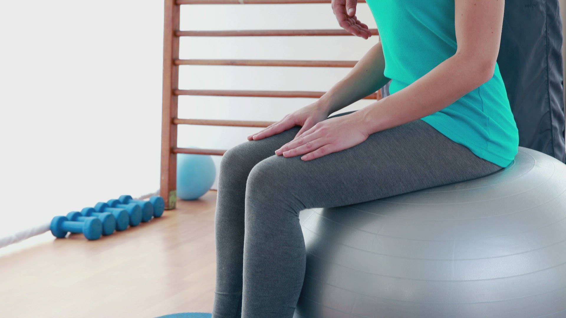 Trainer working with woman on exercise mat in fitness studio