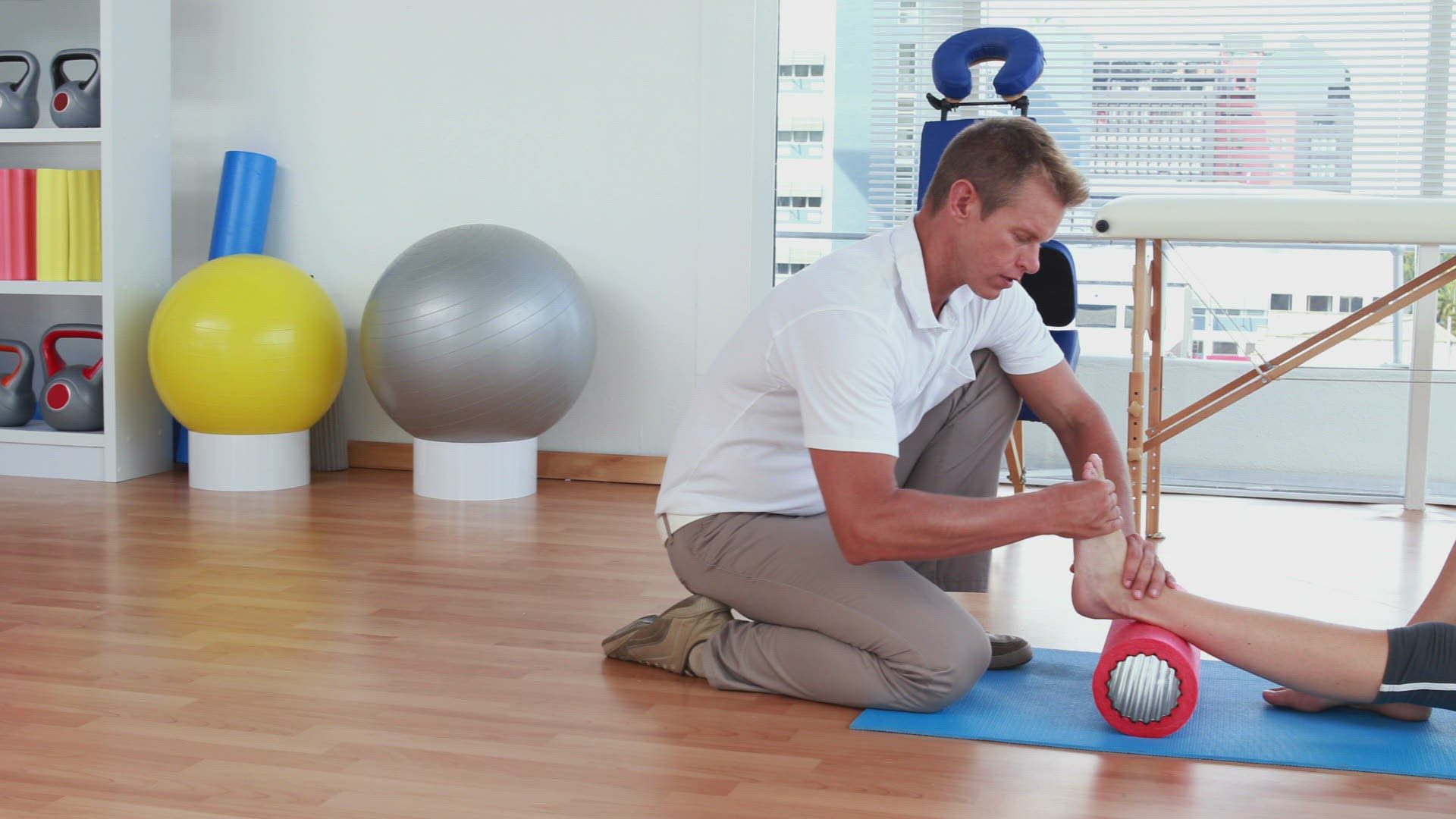 Trainer working with woman on exercise mat in fitness studio