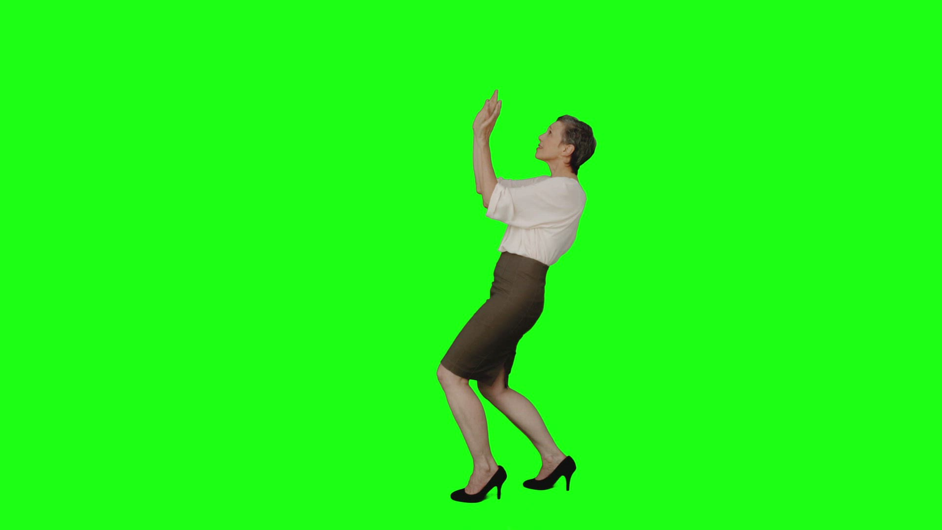 Businesswoman standing with arms raised on green screen background