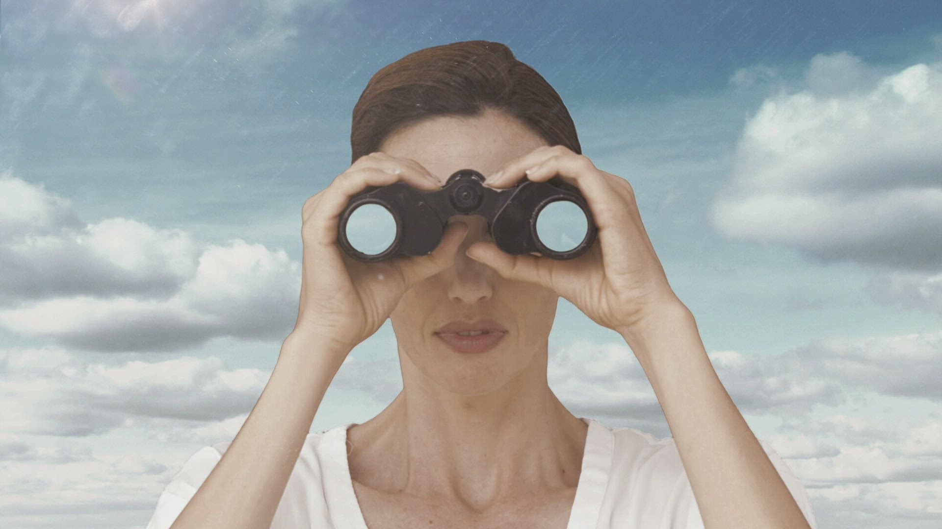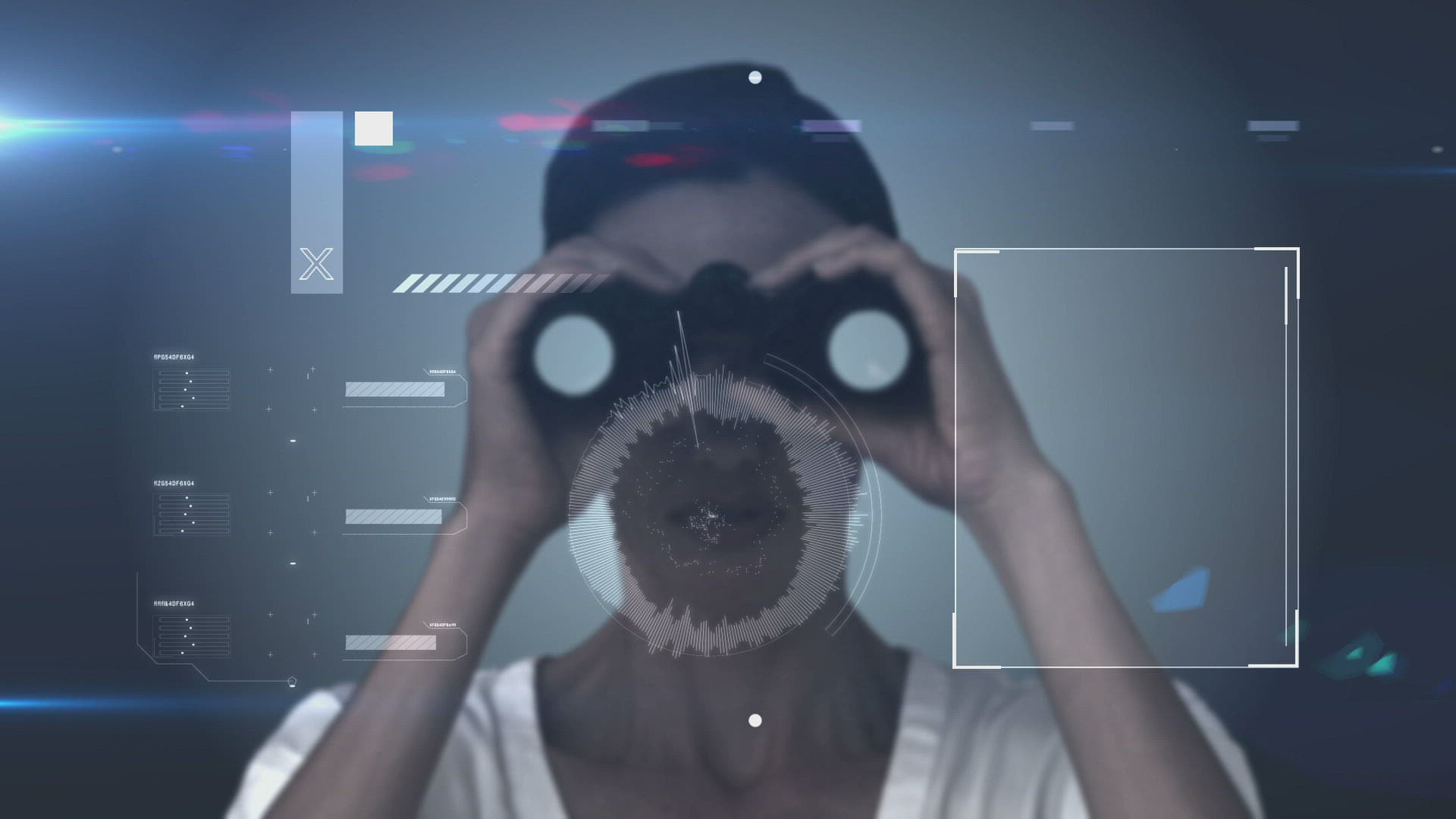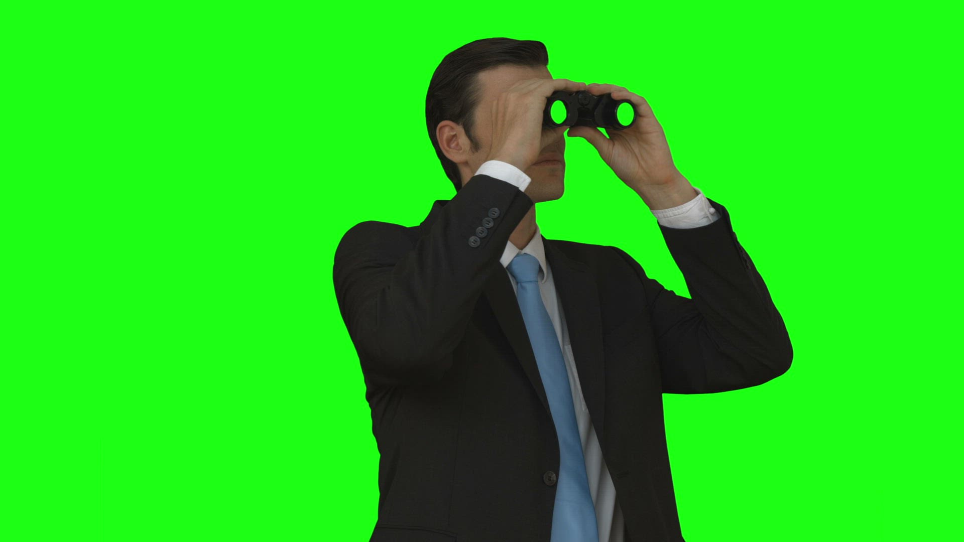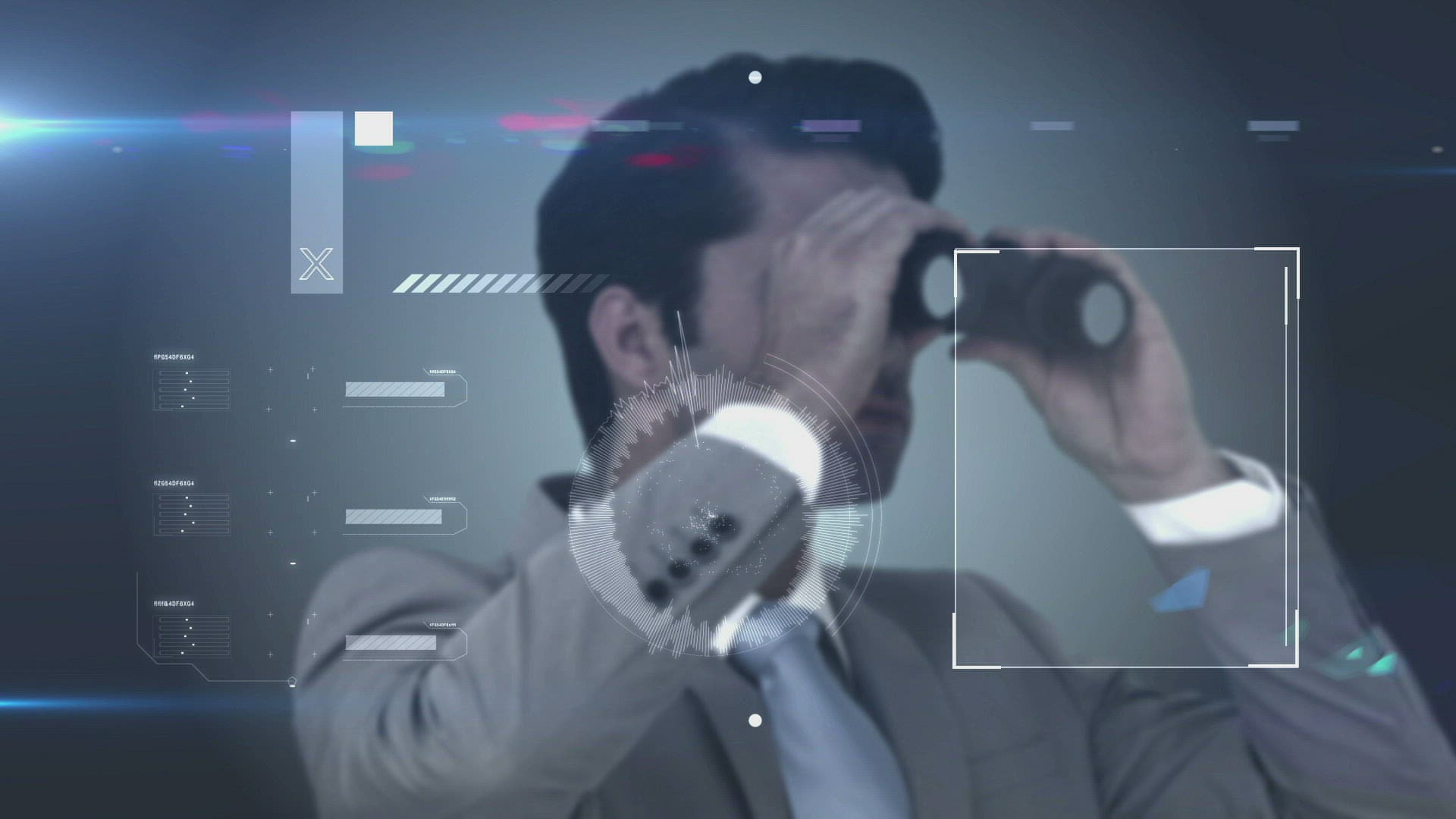 Digital animation of Businessman looking through binoculars against city