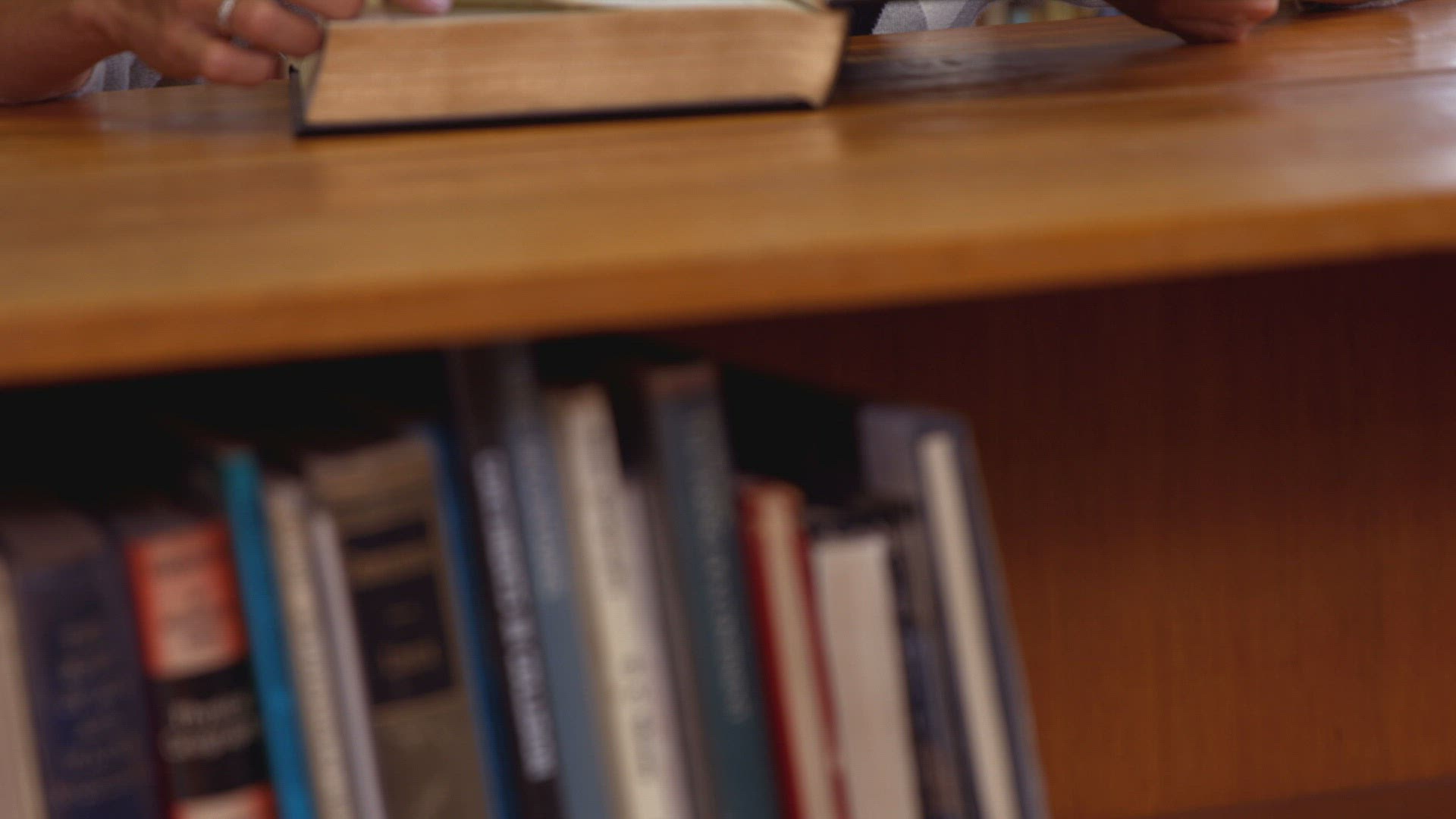 Smiling mature student looking up from her book in library