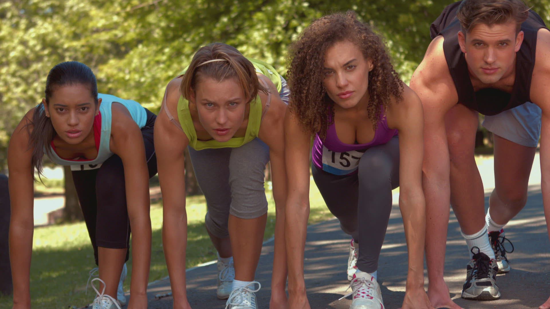 In high quality format fit people running race in park on a sunny day