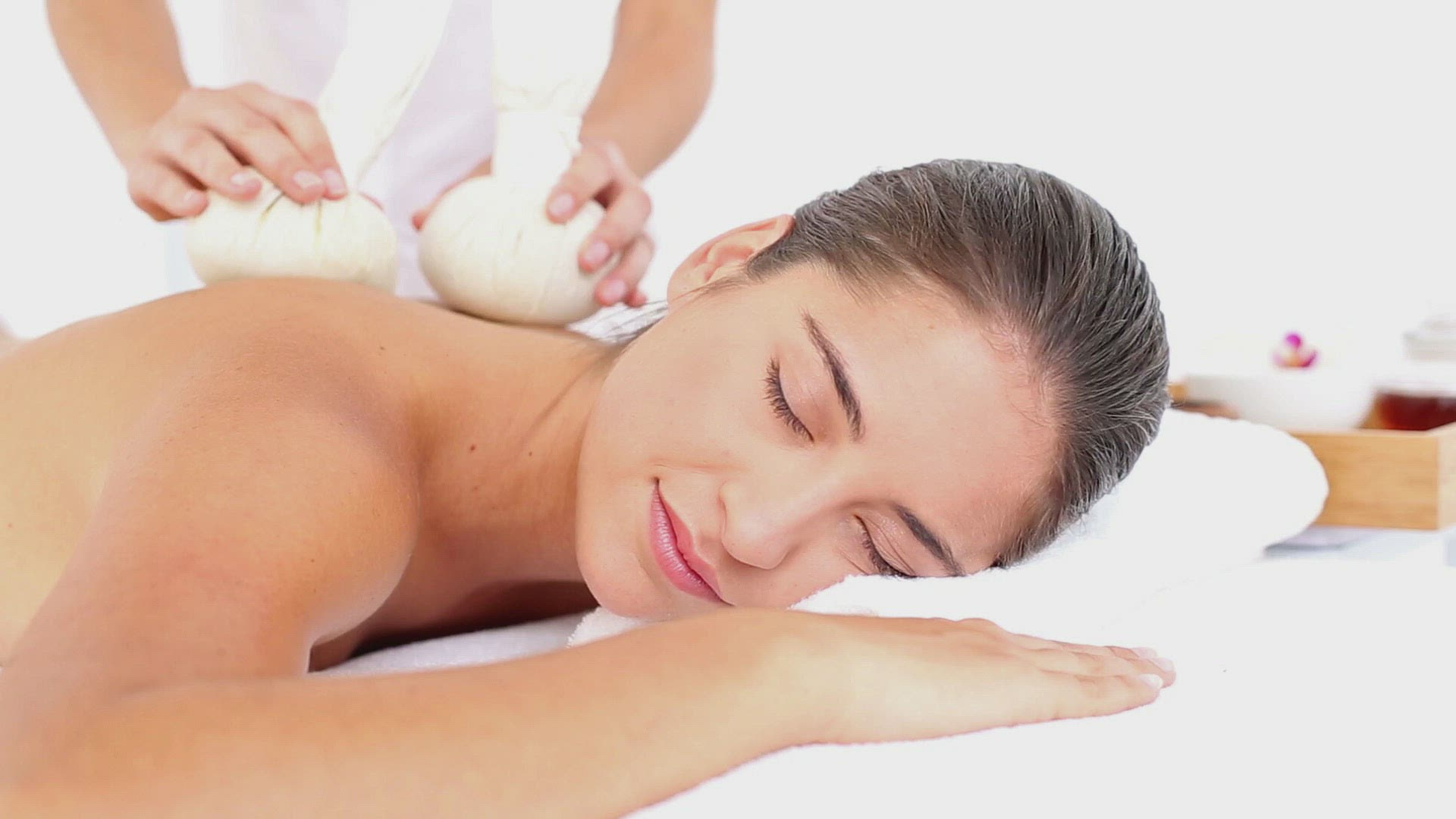 Woman enjoying a herbal compress massage at the health spa in slow motion