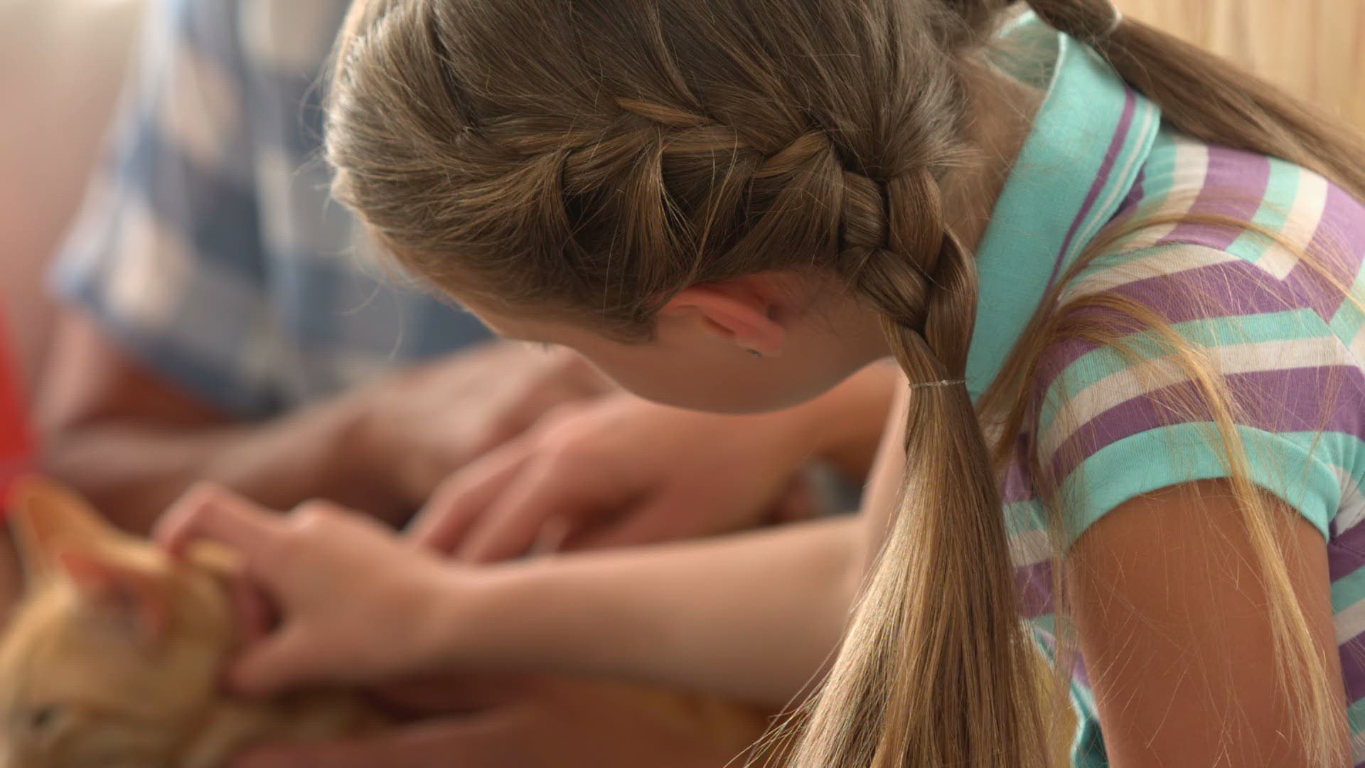 In slow motion boy with kitten over white background