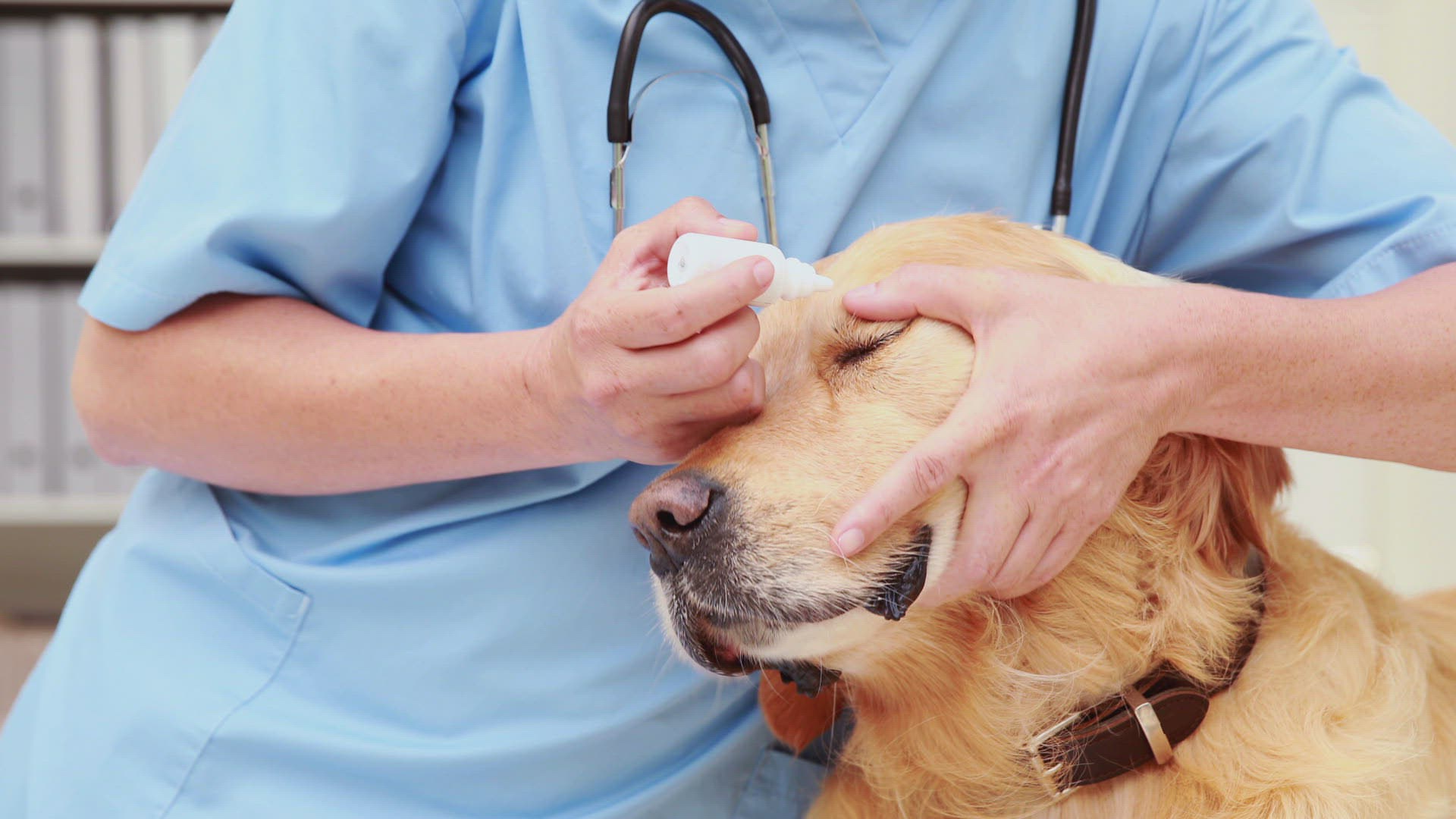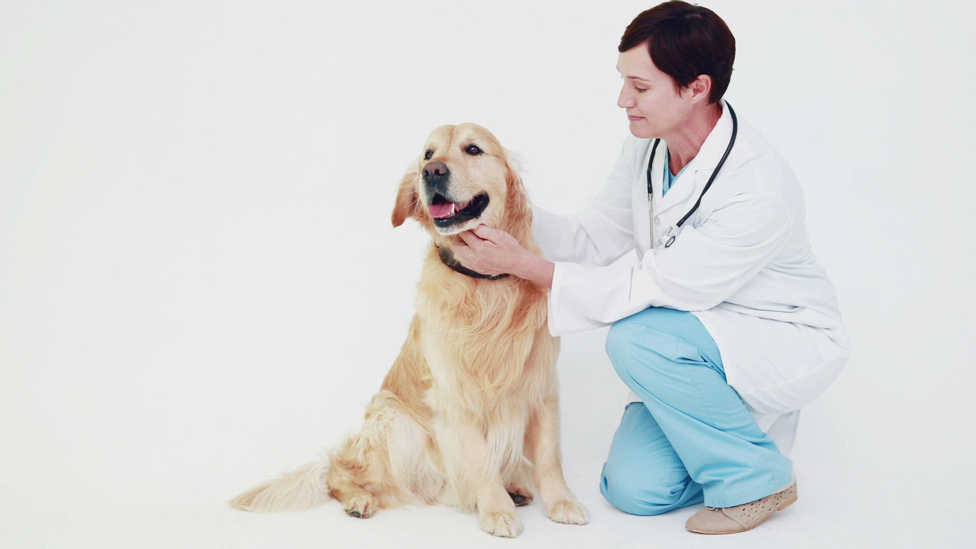 Smiling female vet bandaging dogs leg in medical office