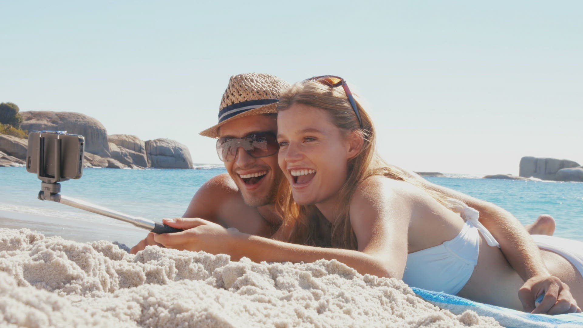 In 4k format happy couple doing selfie with monopod