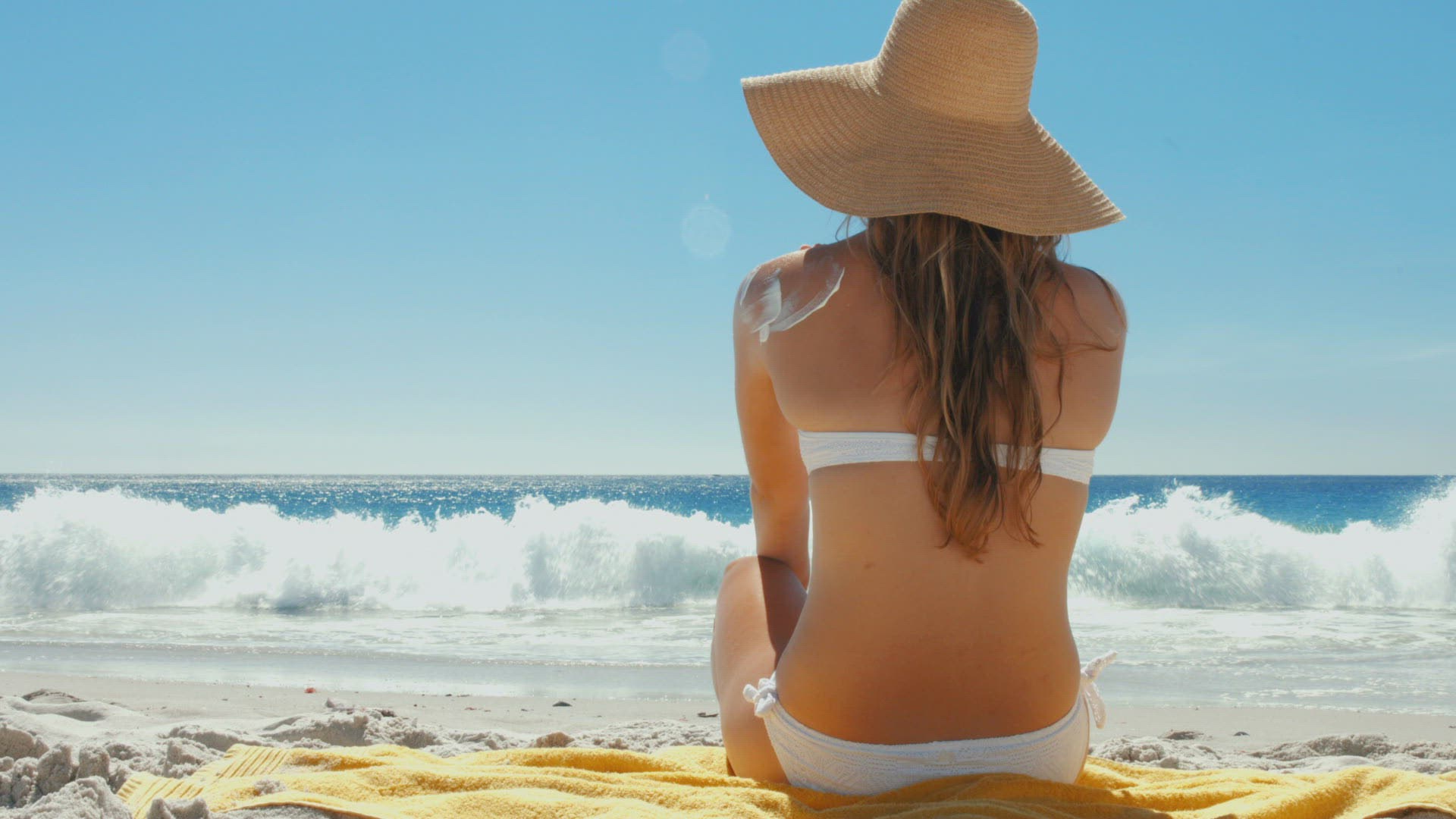 In 4k format man applying sunscreen on his girlfriend