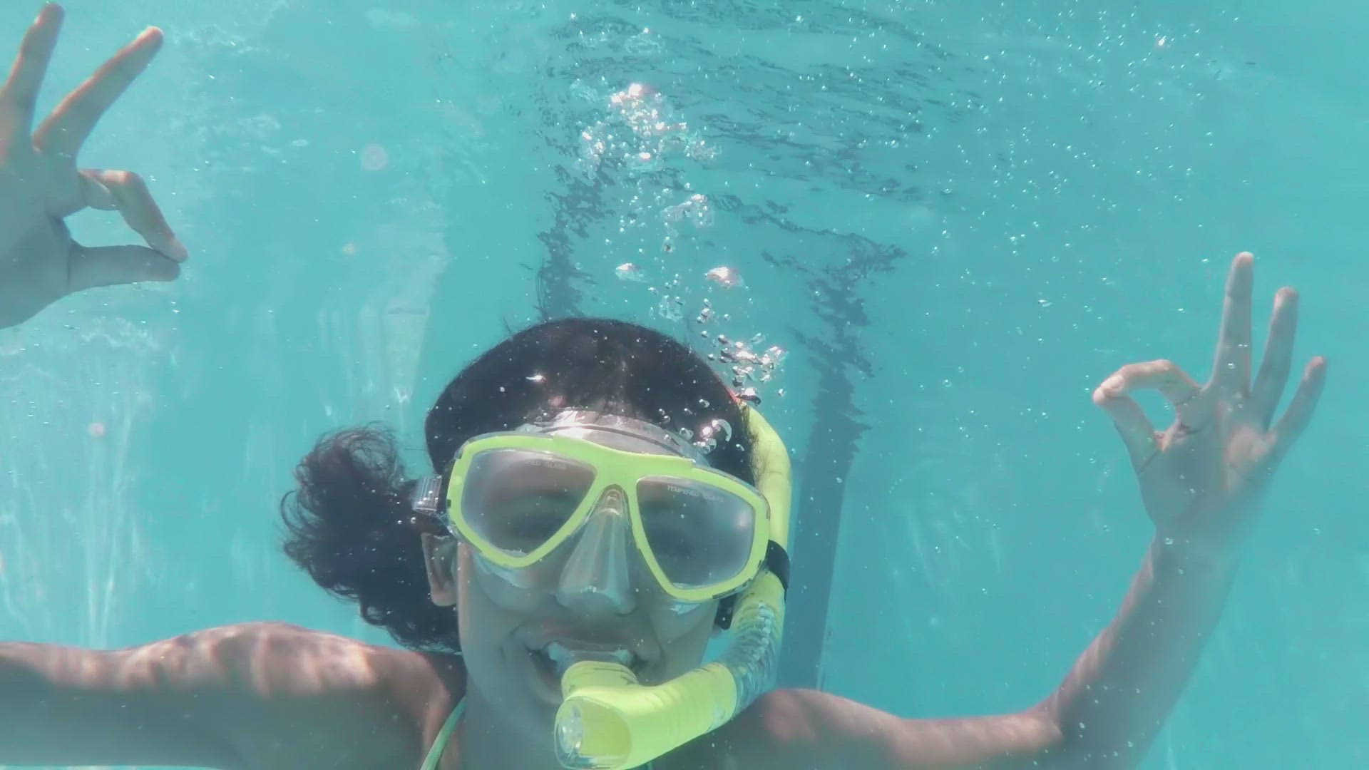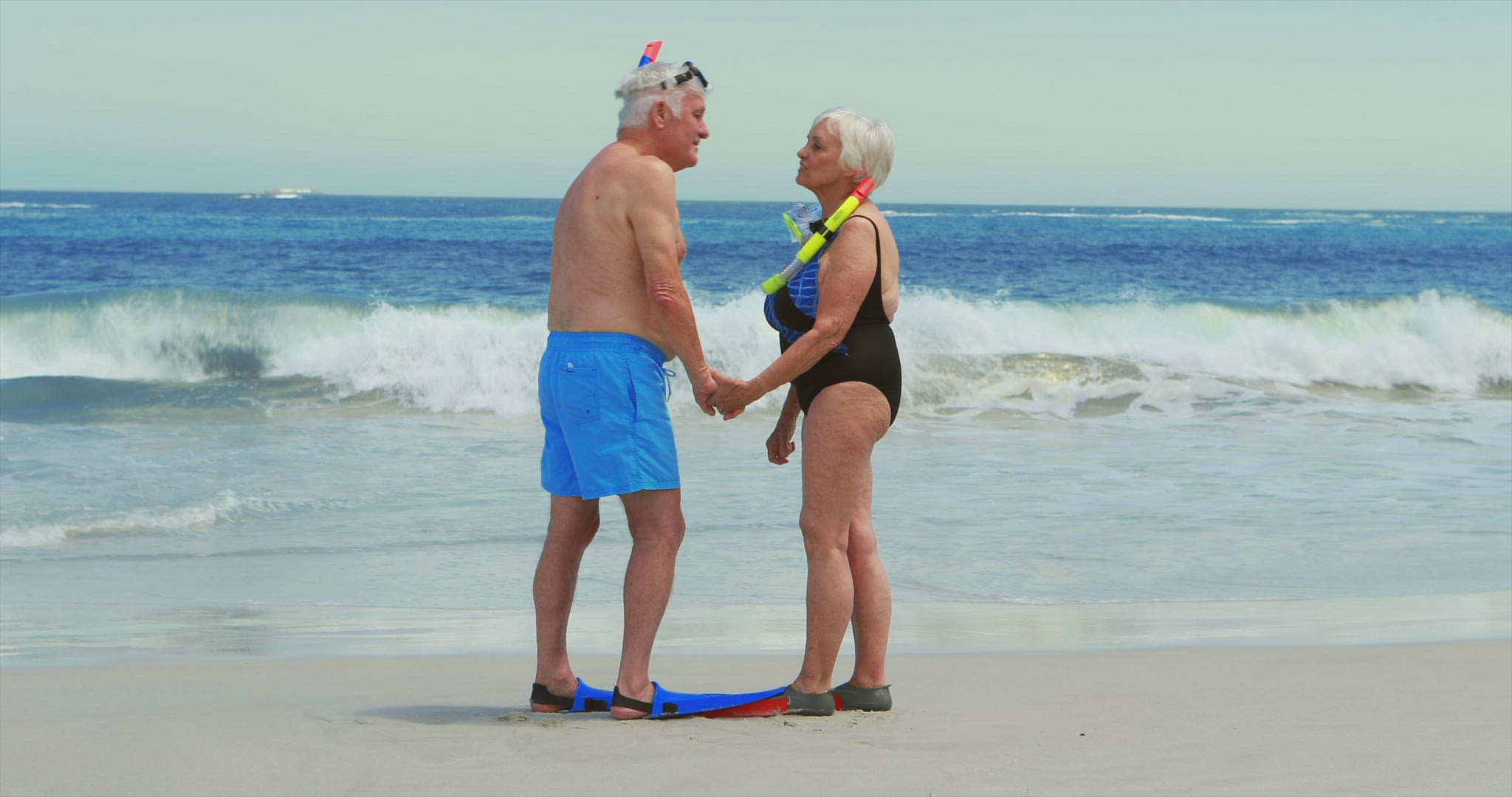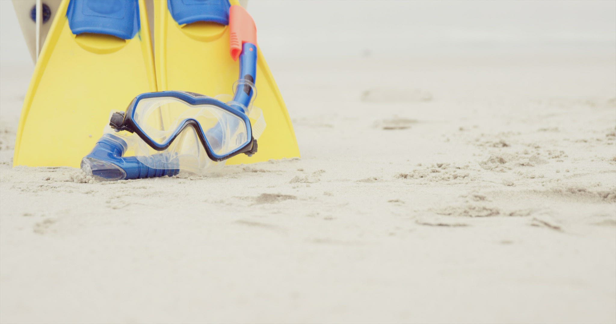 Happy couple lying in the sand with mask and snorkel in slow motion