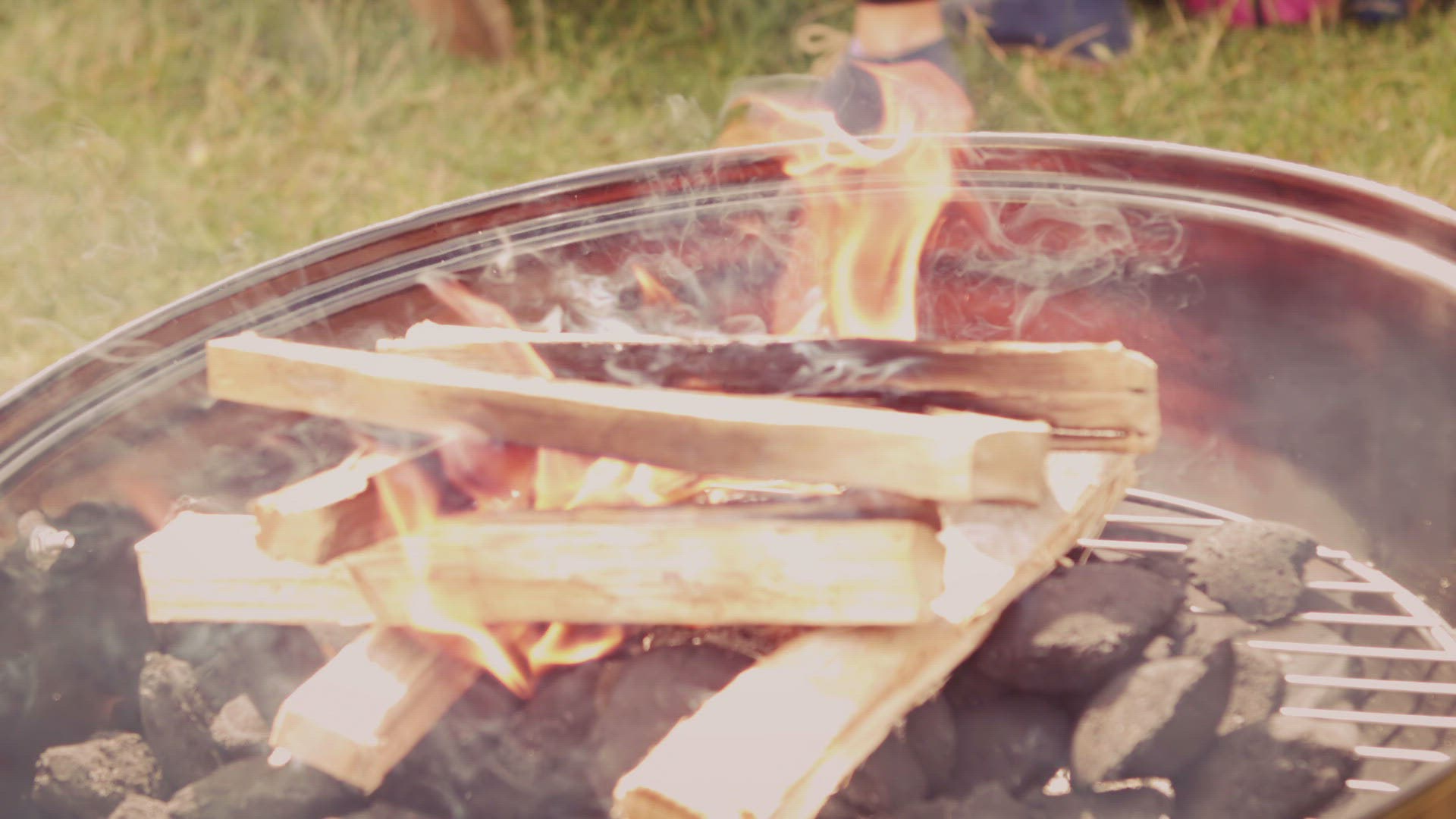 In slow motion flaming barbecue in the park on a sunny day