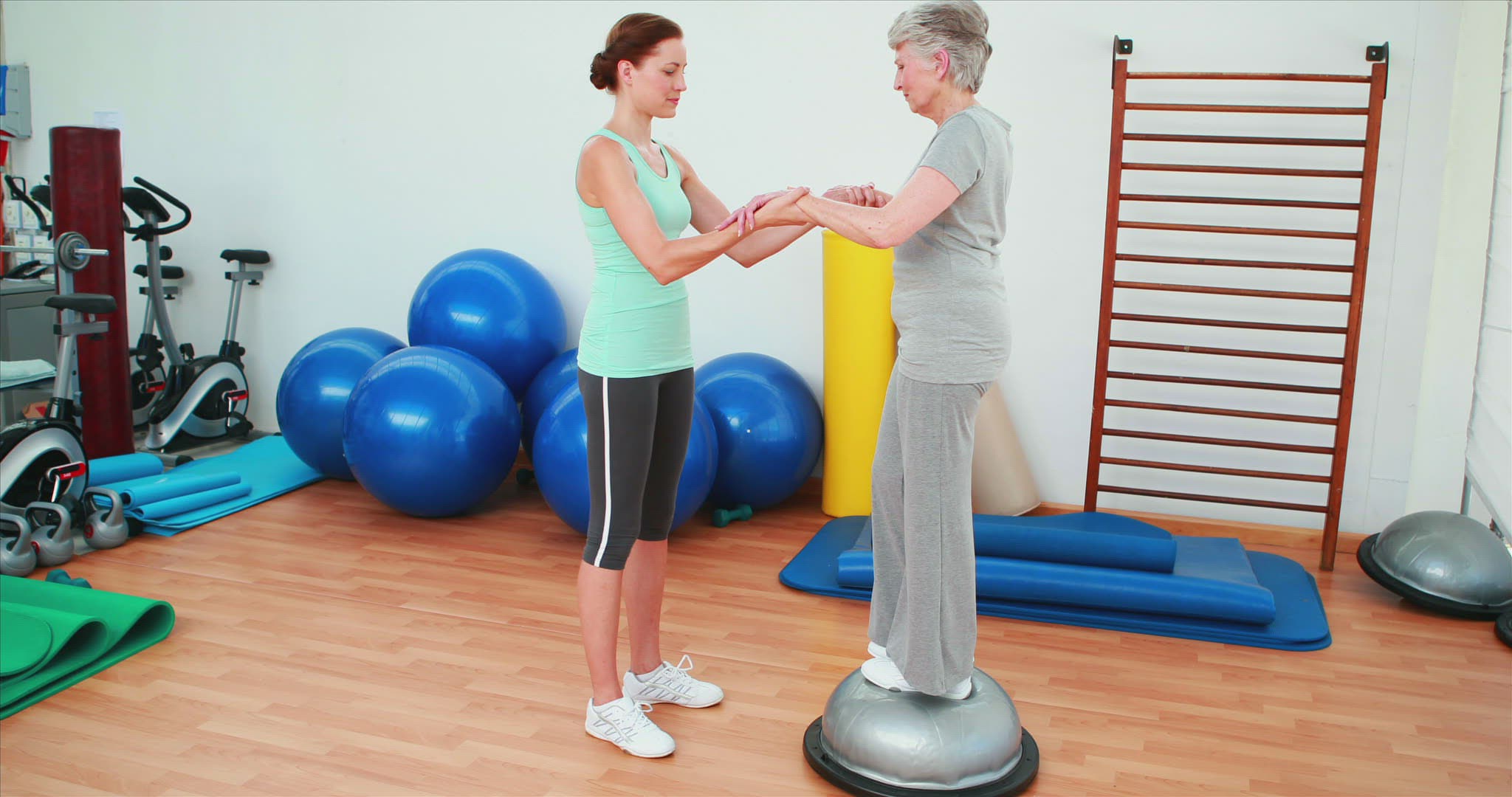 Fit woman doing bosu press up with trainer at a crossfit gym