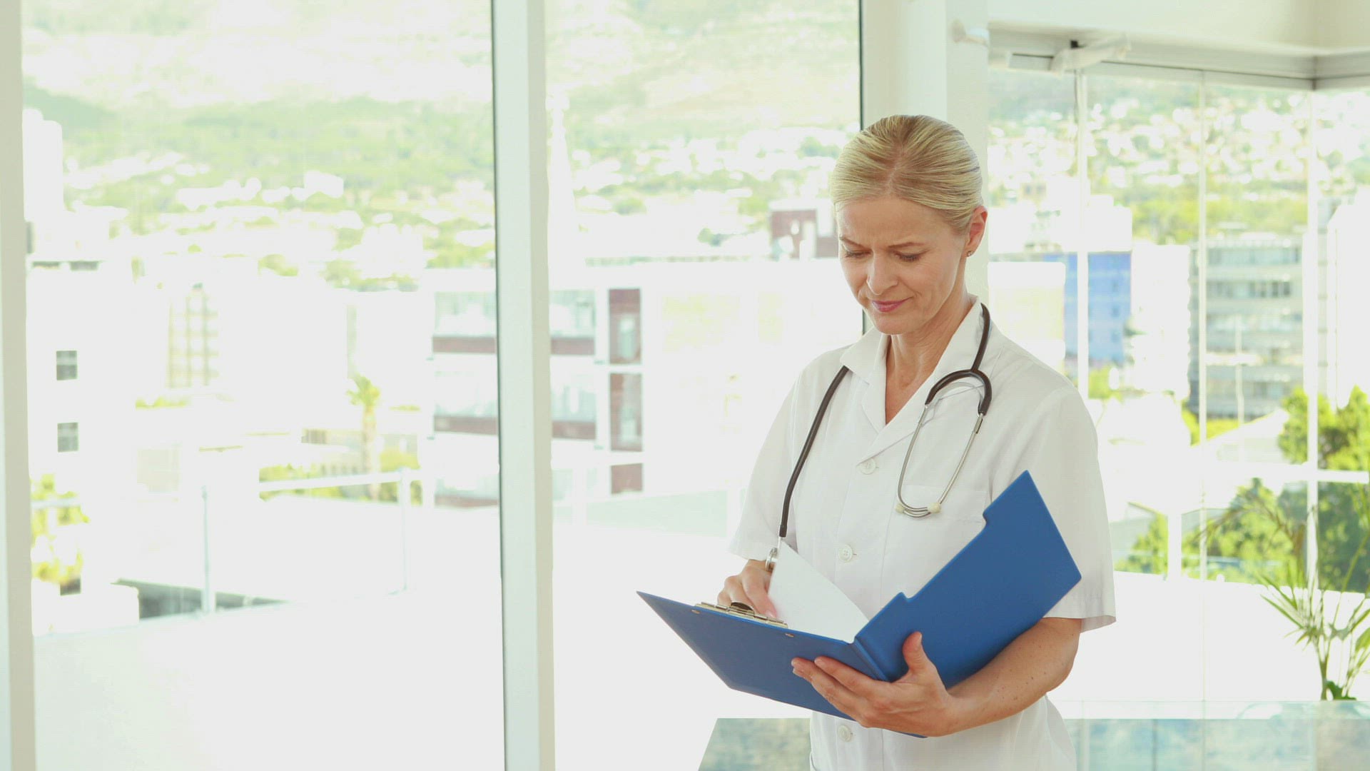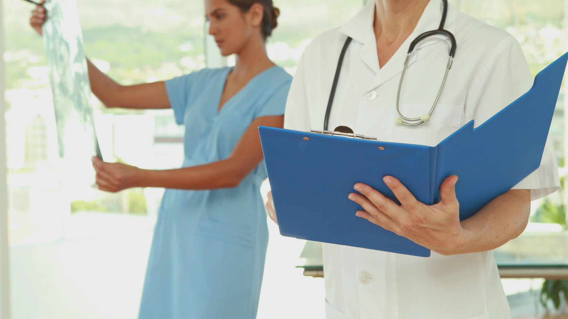 Two serious doctors looking at Xray in slow motion