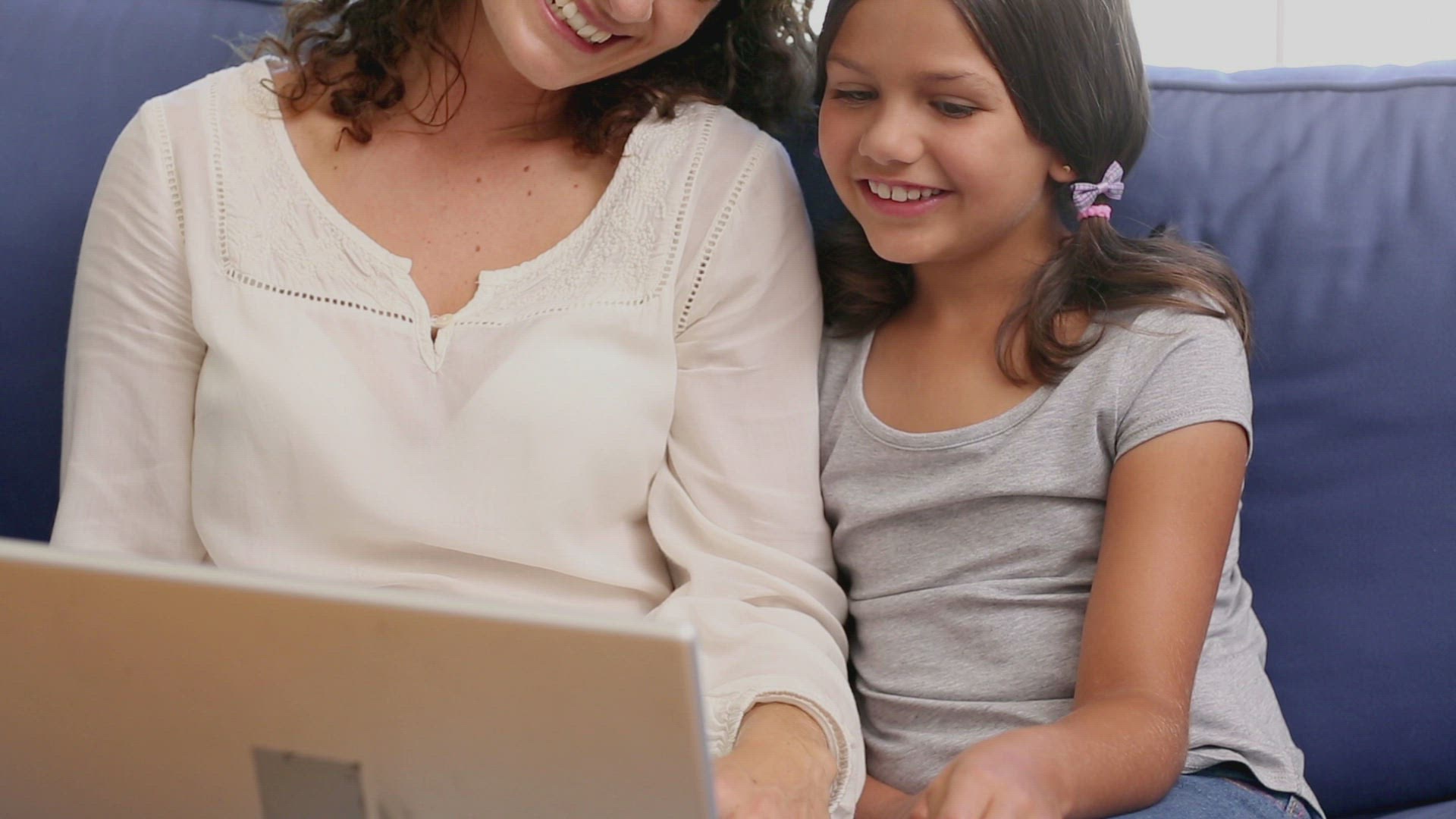 Mother and daughter using laptop at home in the living room