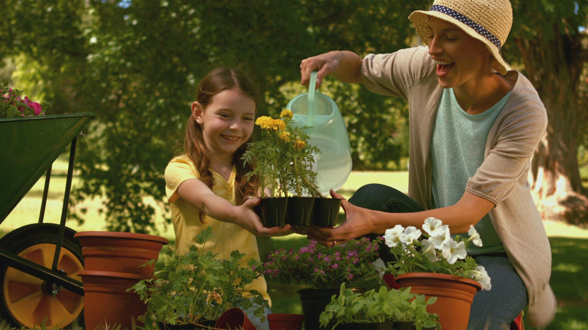 Happy little girl lying on grass and looking at camera in park
