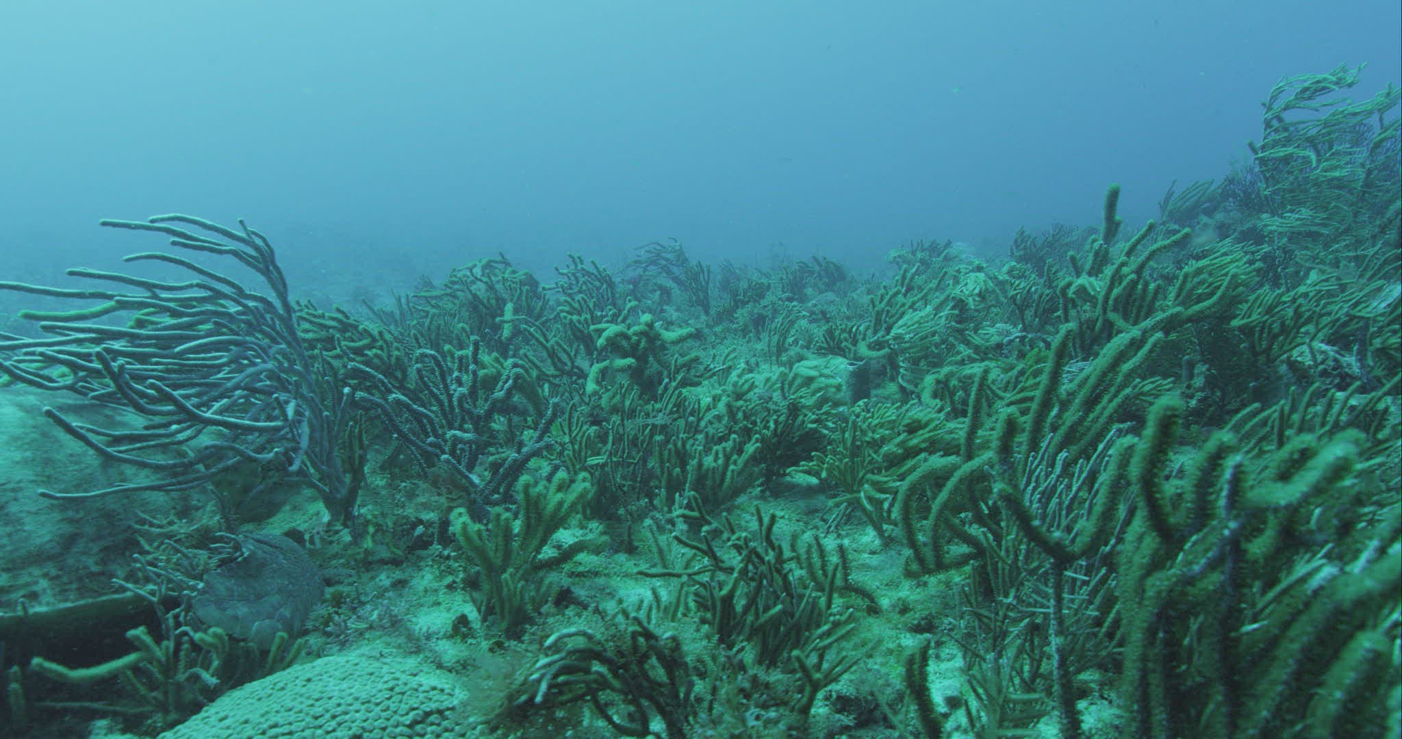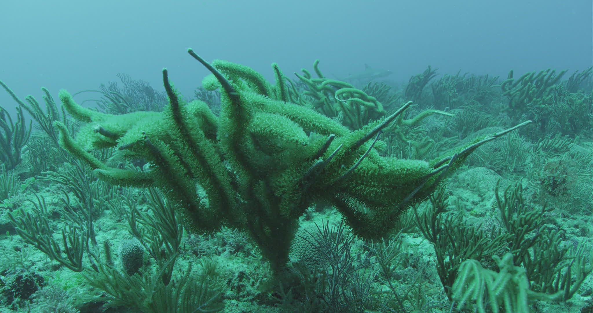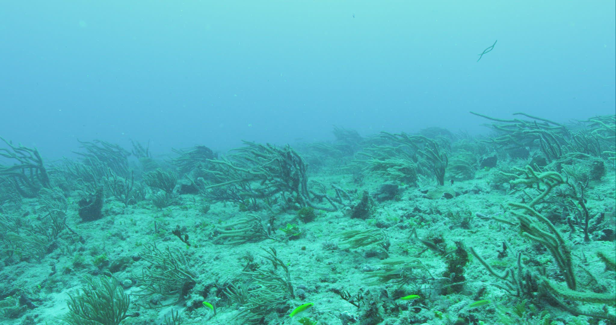 Fish swimming in a tank with algae at the aquarium