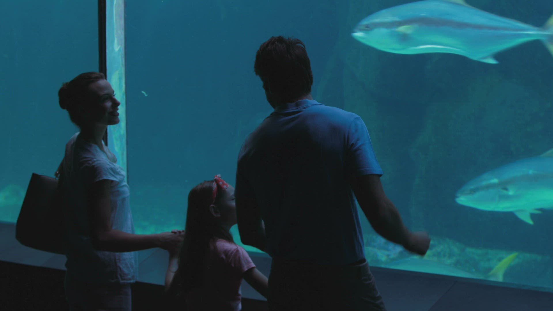Young man touching a fish-tank behind camera at the aquarium