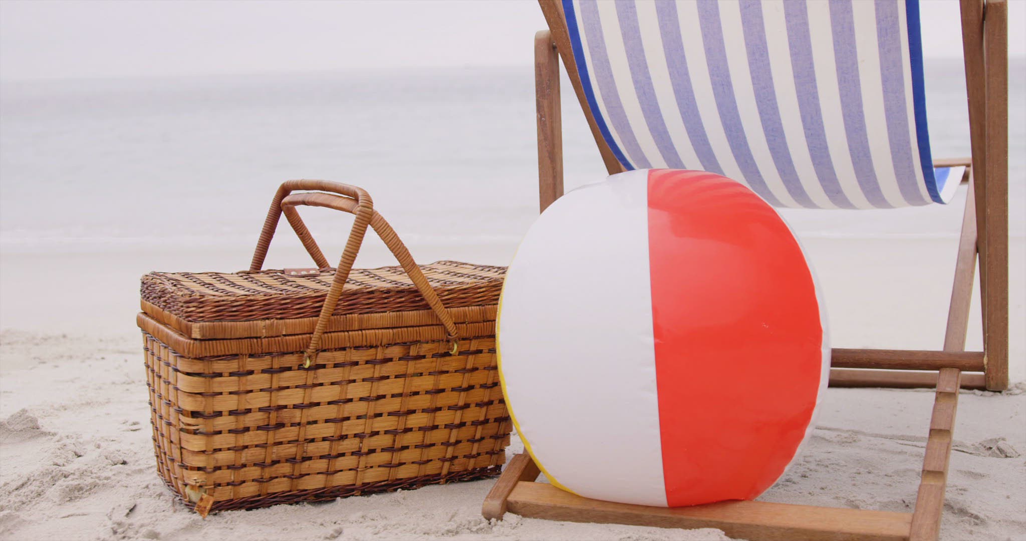 Deck chairs on the sand with towel; hat; ball and basket