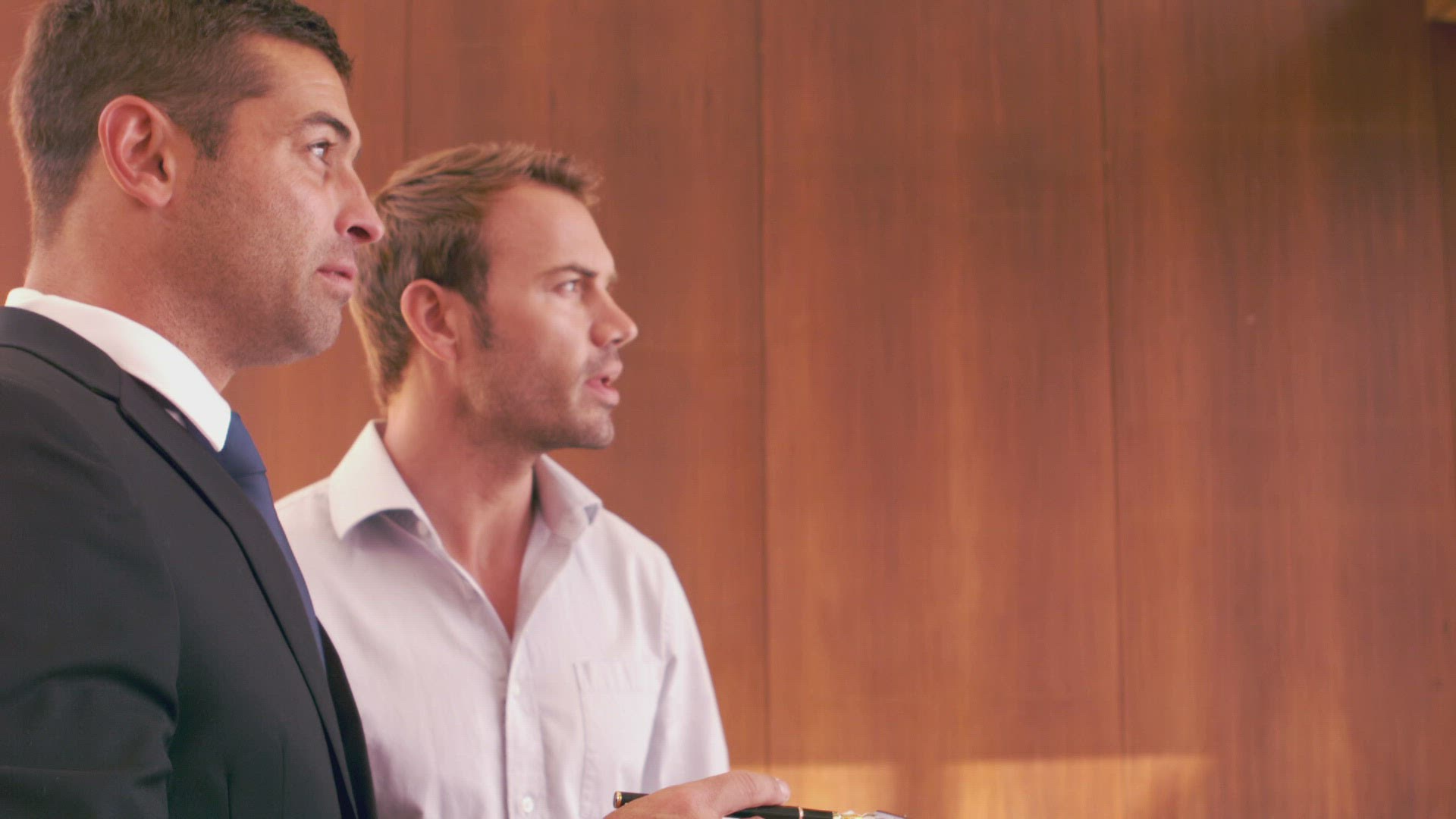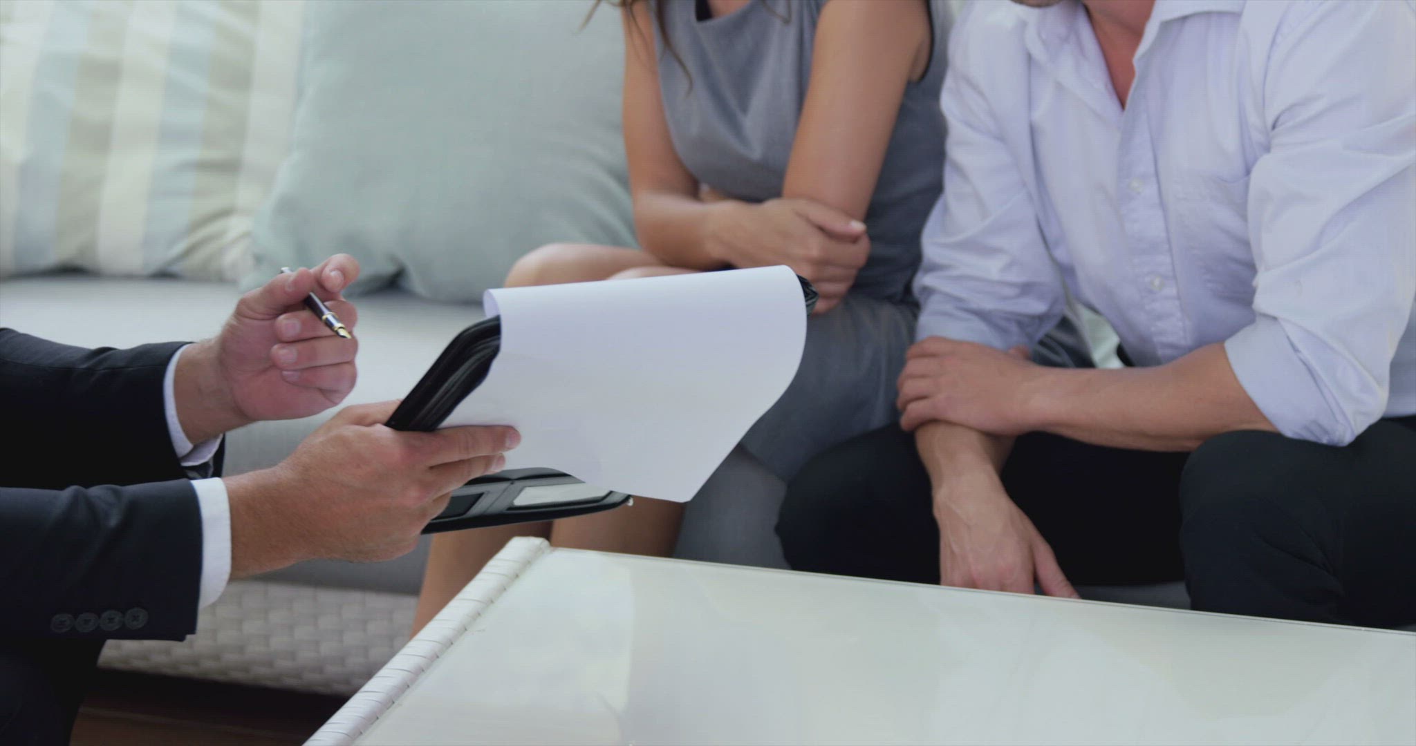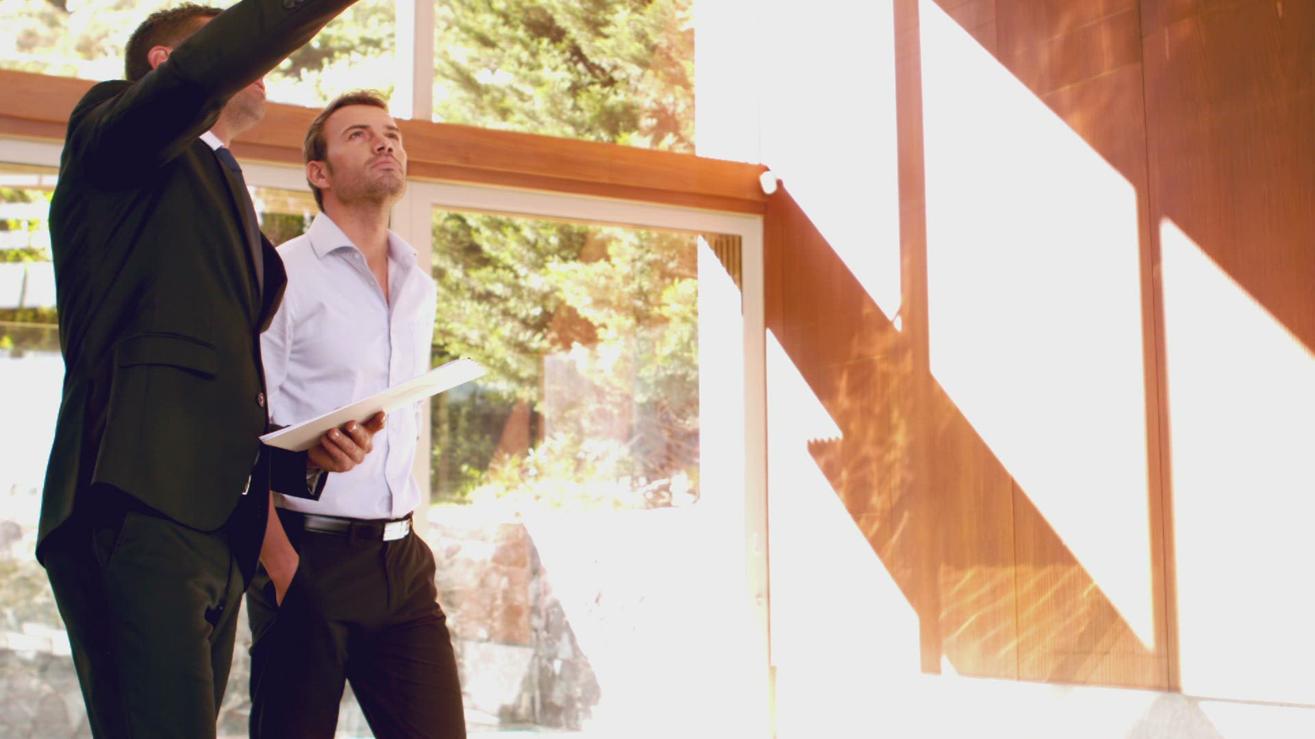 Estate agent talking to client and handshaking in a house