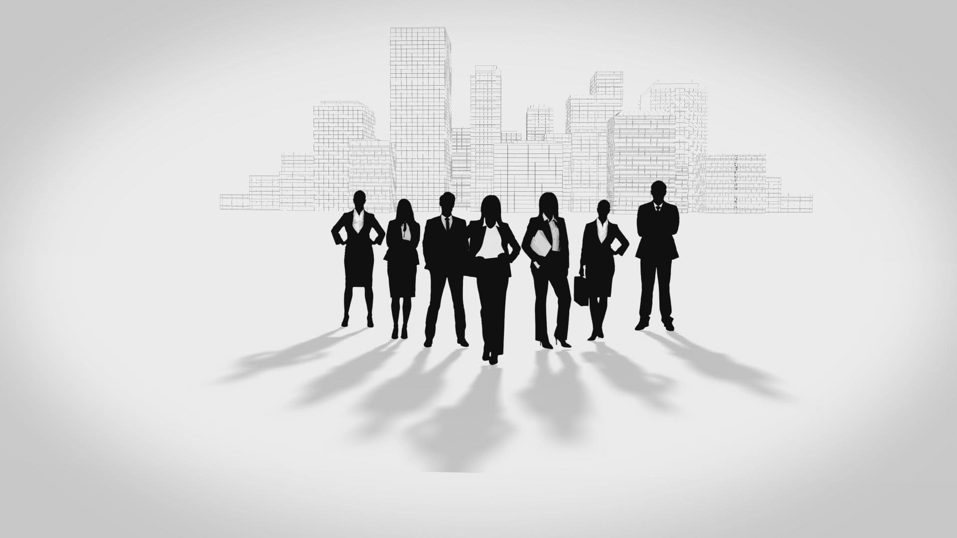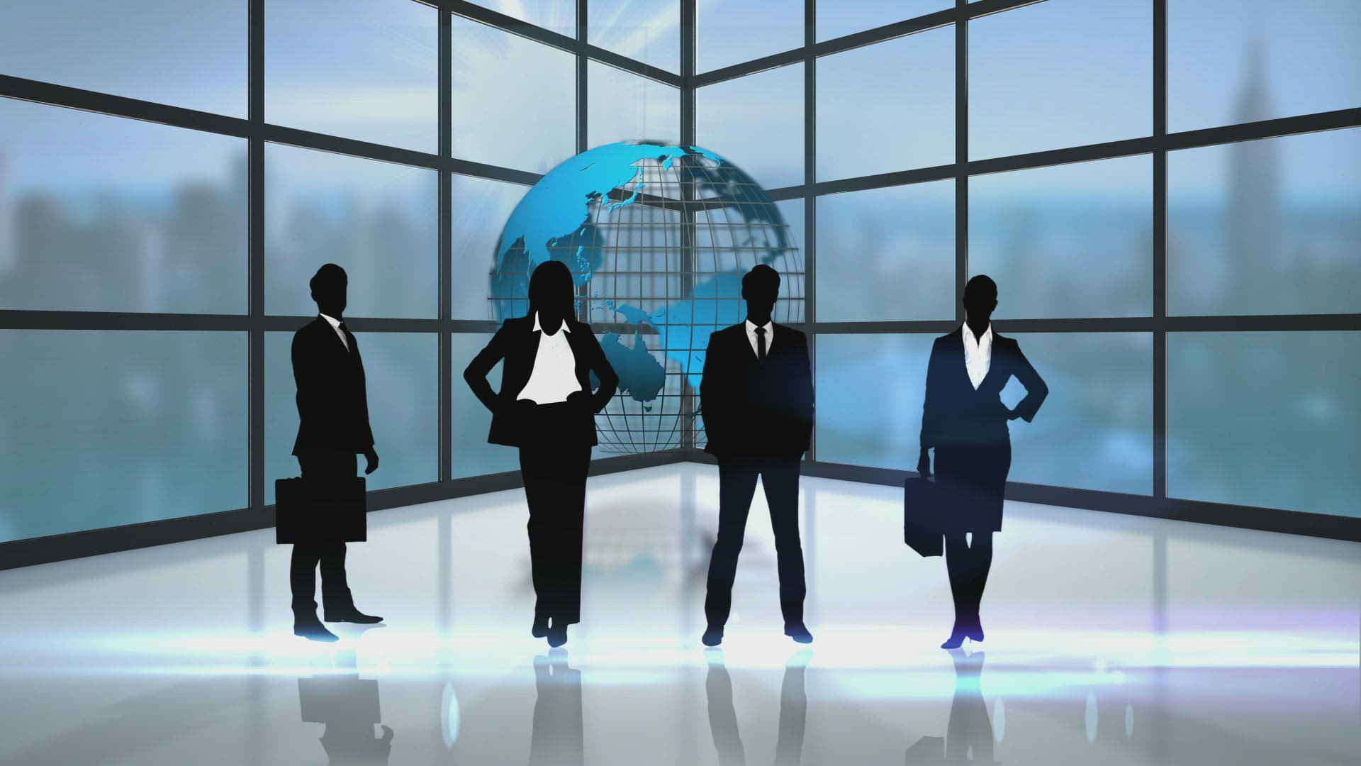 Black silhouettes of business people with rotating globe