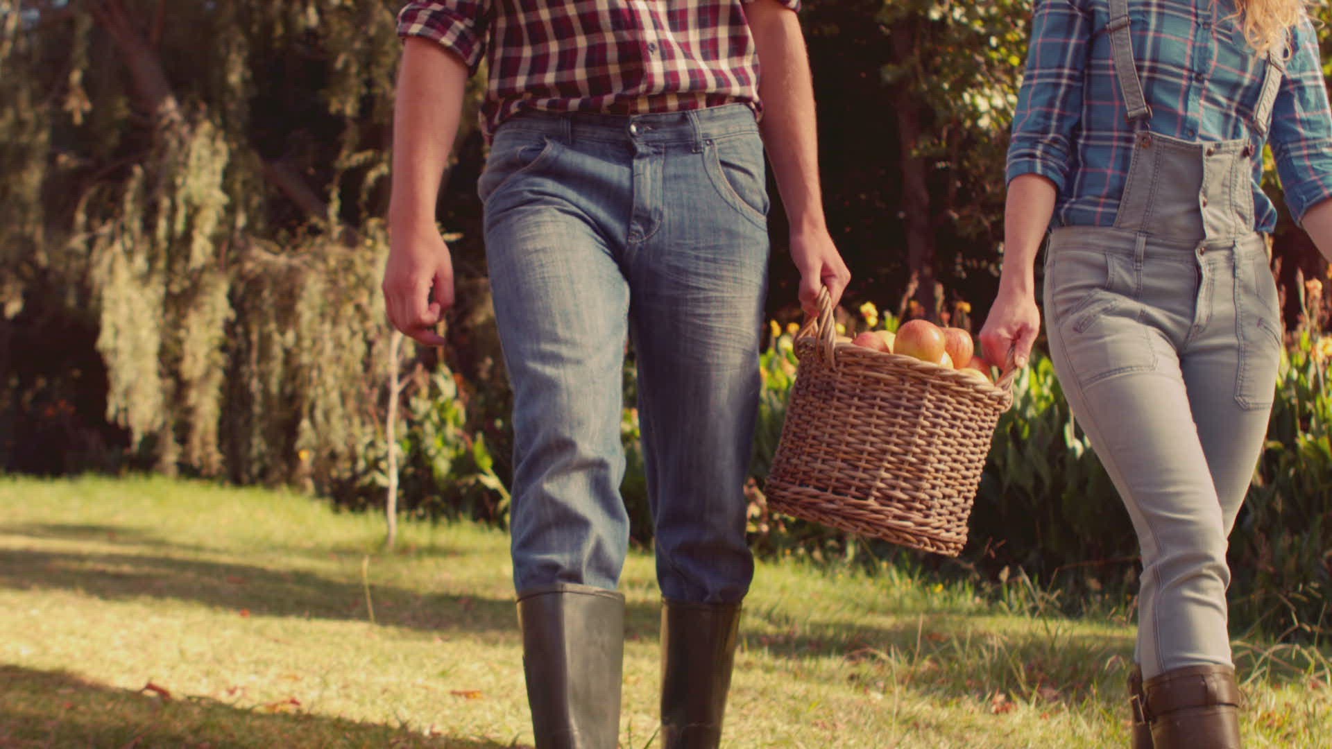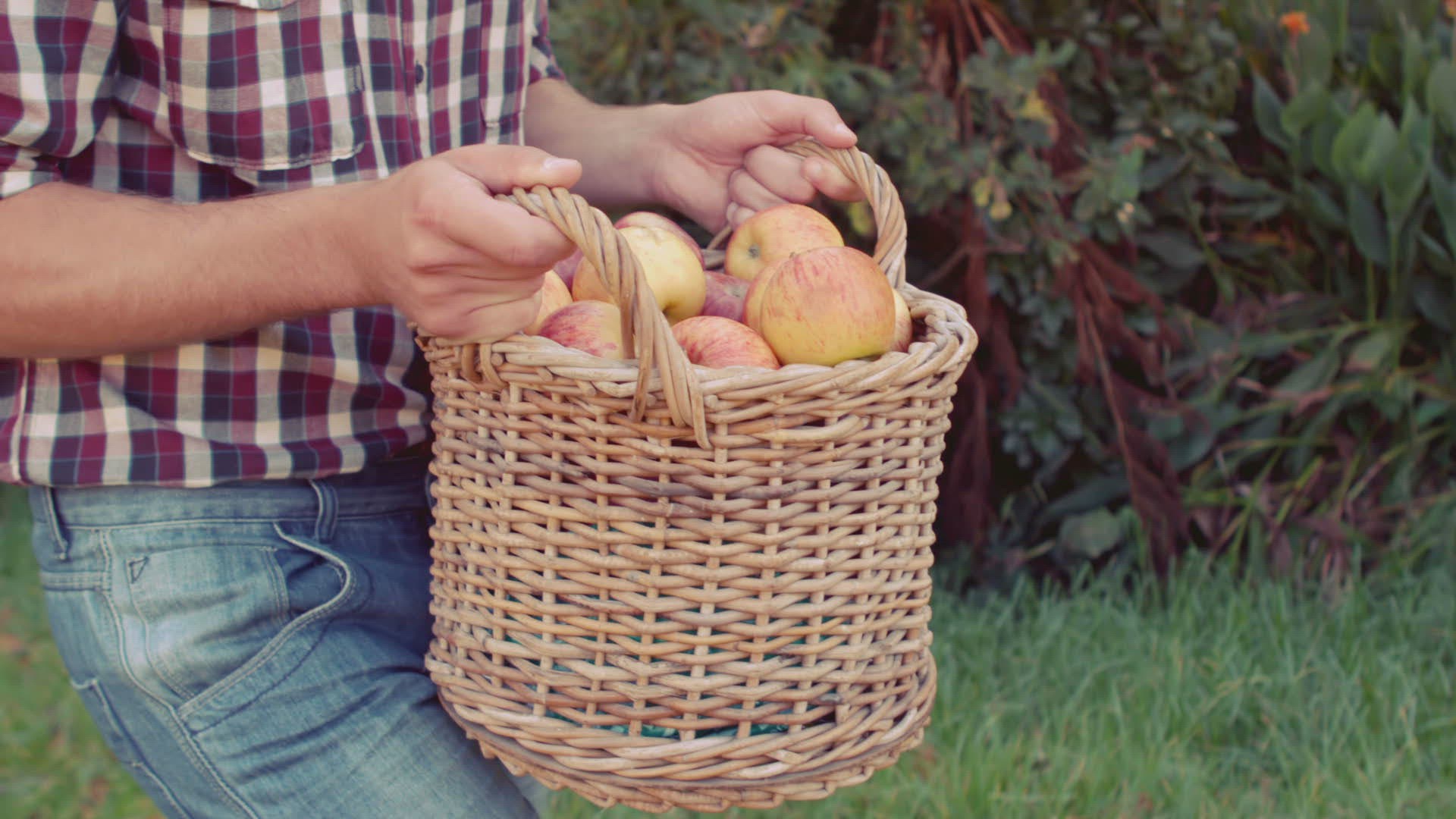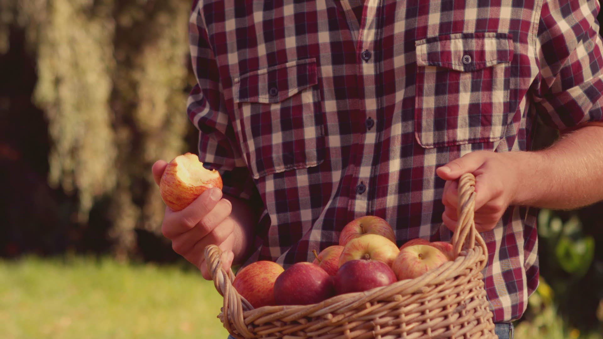 Happy woman giving apple to her husband on a sunny day in slow motion