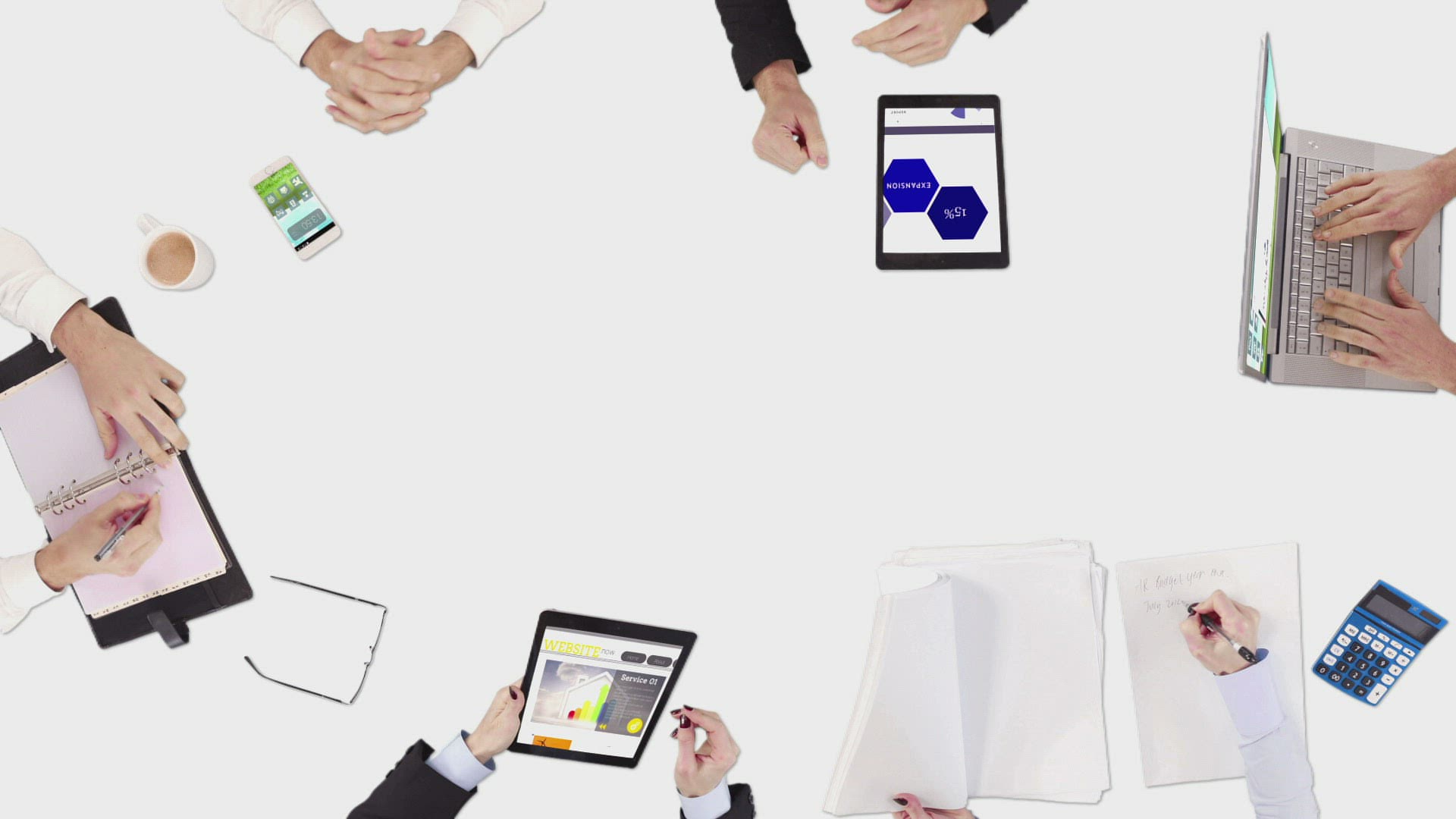 Business people hands working with icons on white screen