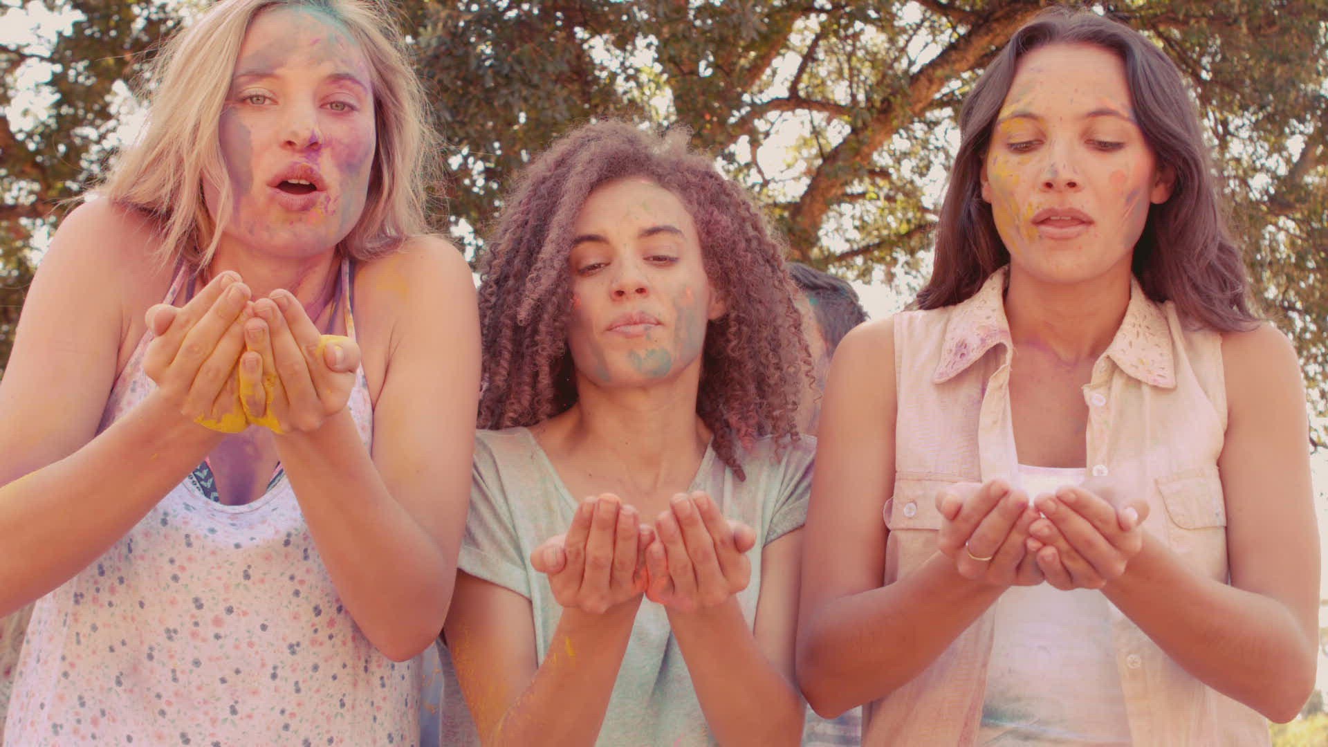 Young women having fun with powder paint on a sunny day in slow motion