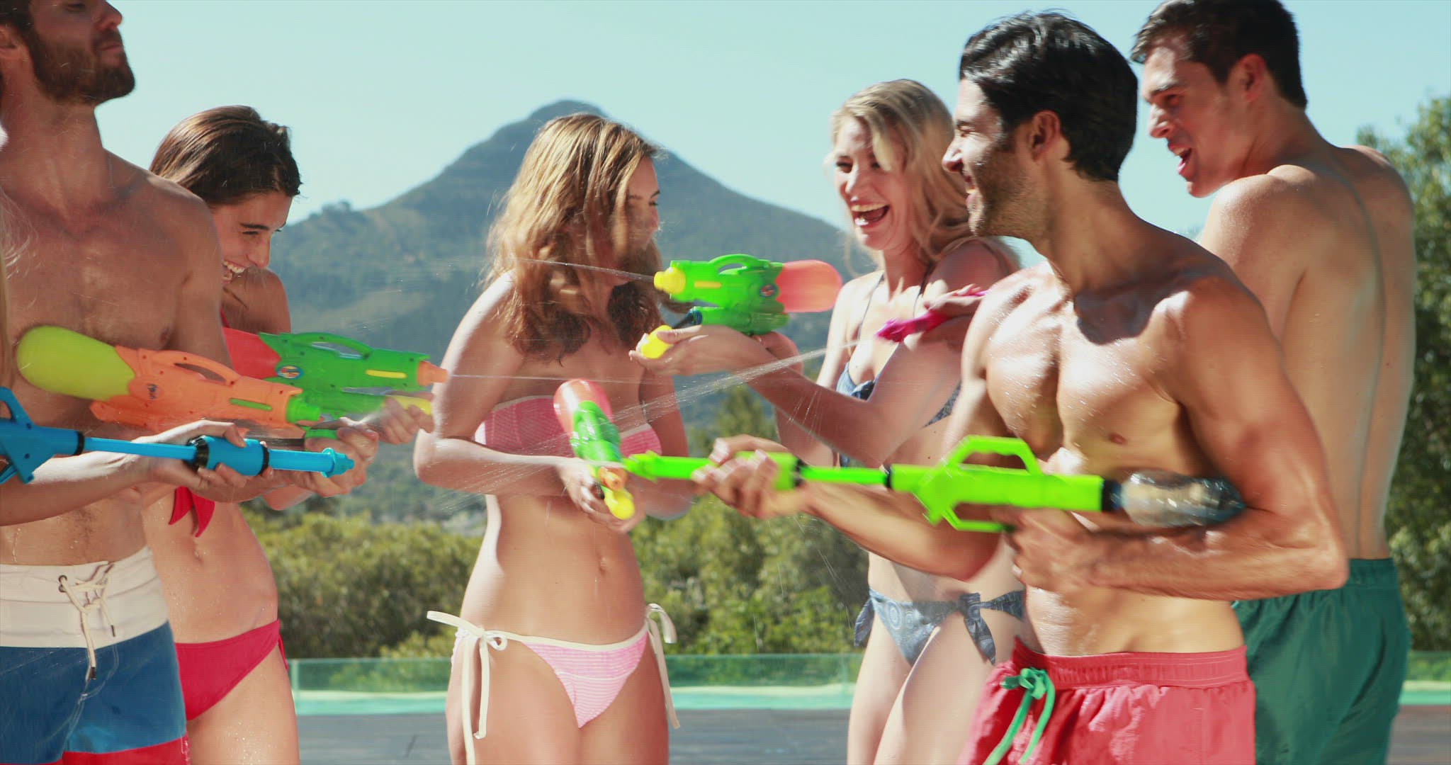 Happy friends doing water gun battle nearby swimming pool
