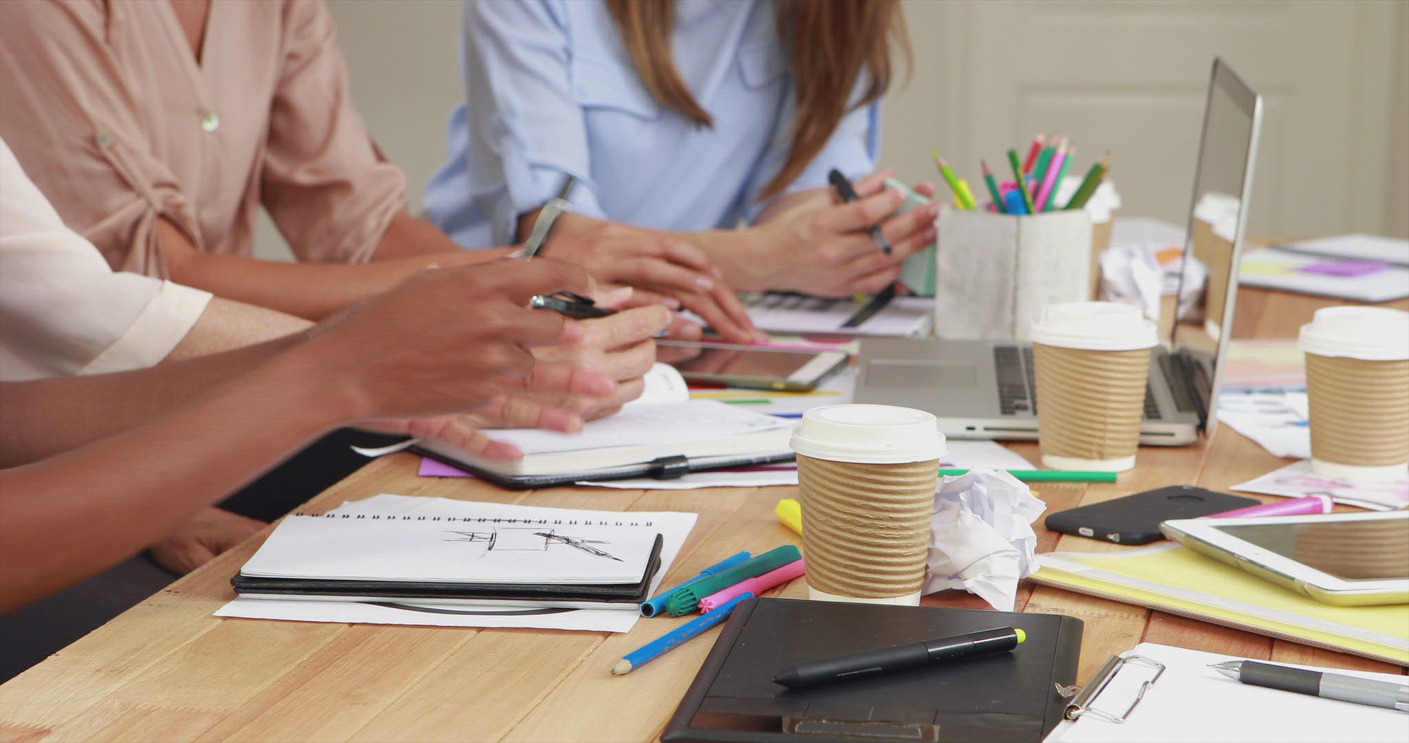 Mid section of women working in office with laptop