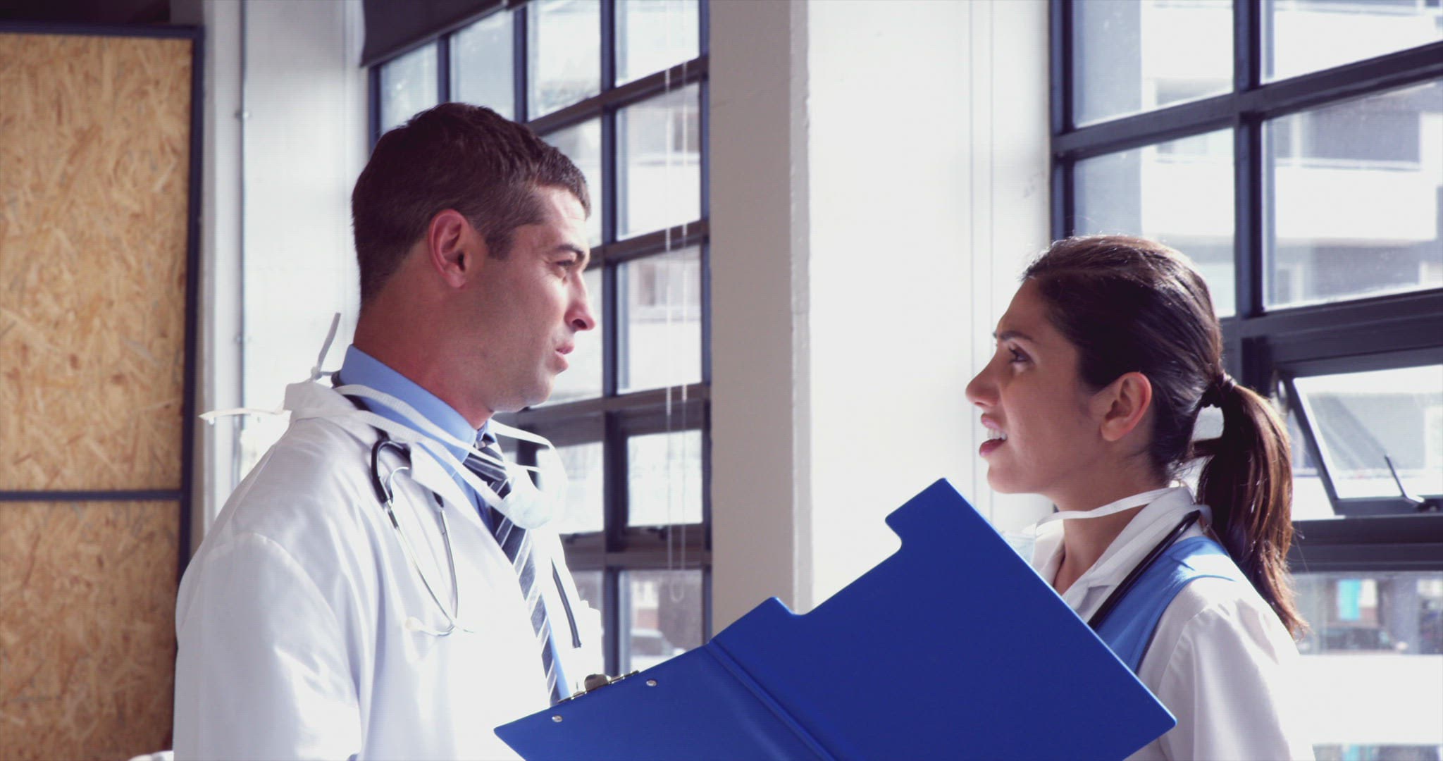 Doctors speaking together while writing notes on clipboard in hospital