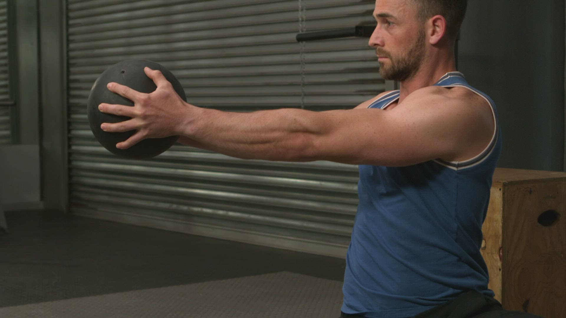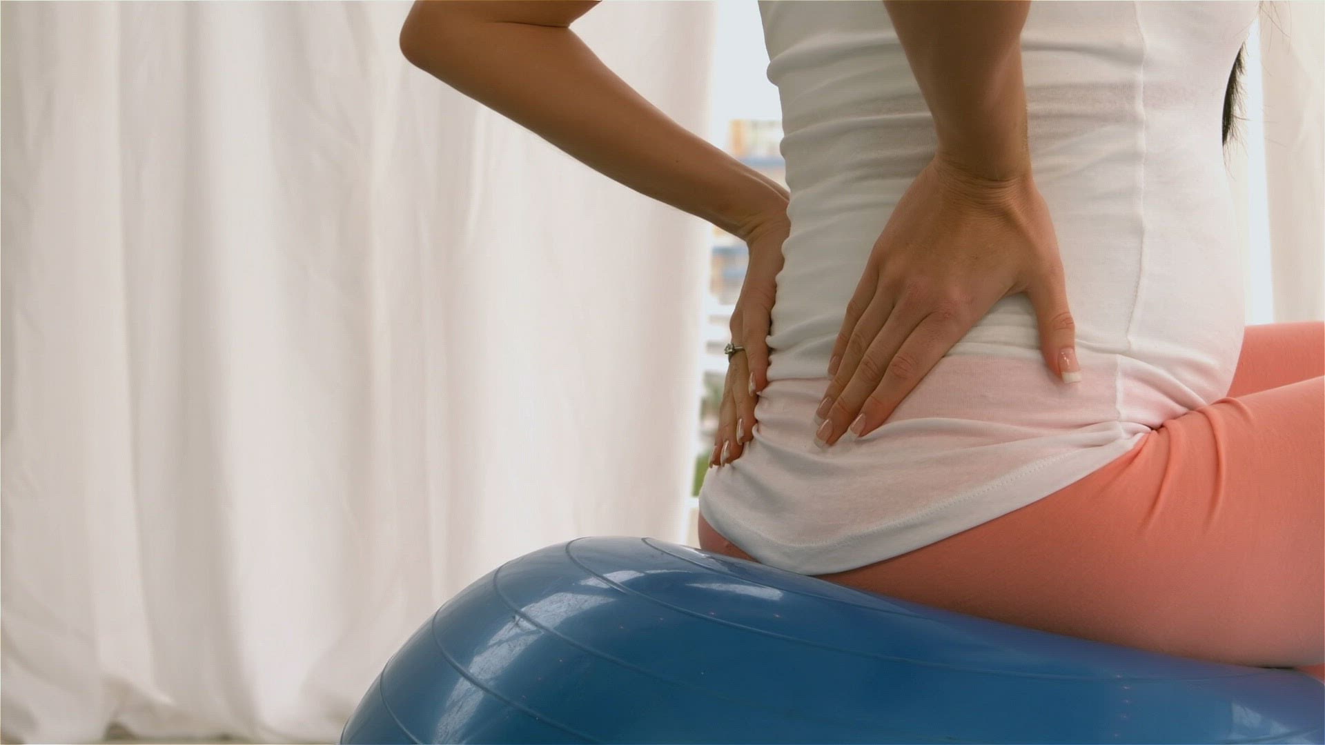 Pregnant woman on fitness ball with arms outstretched near pool