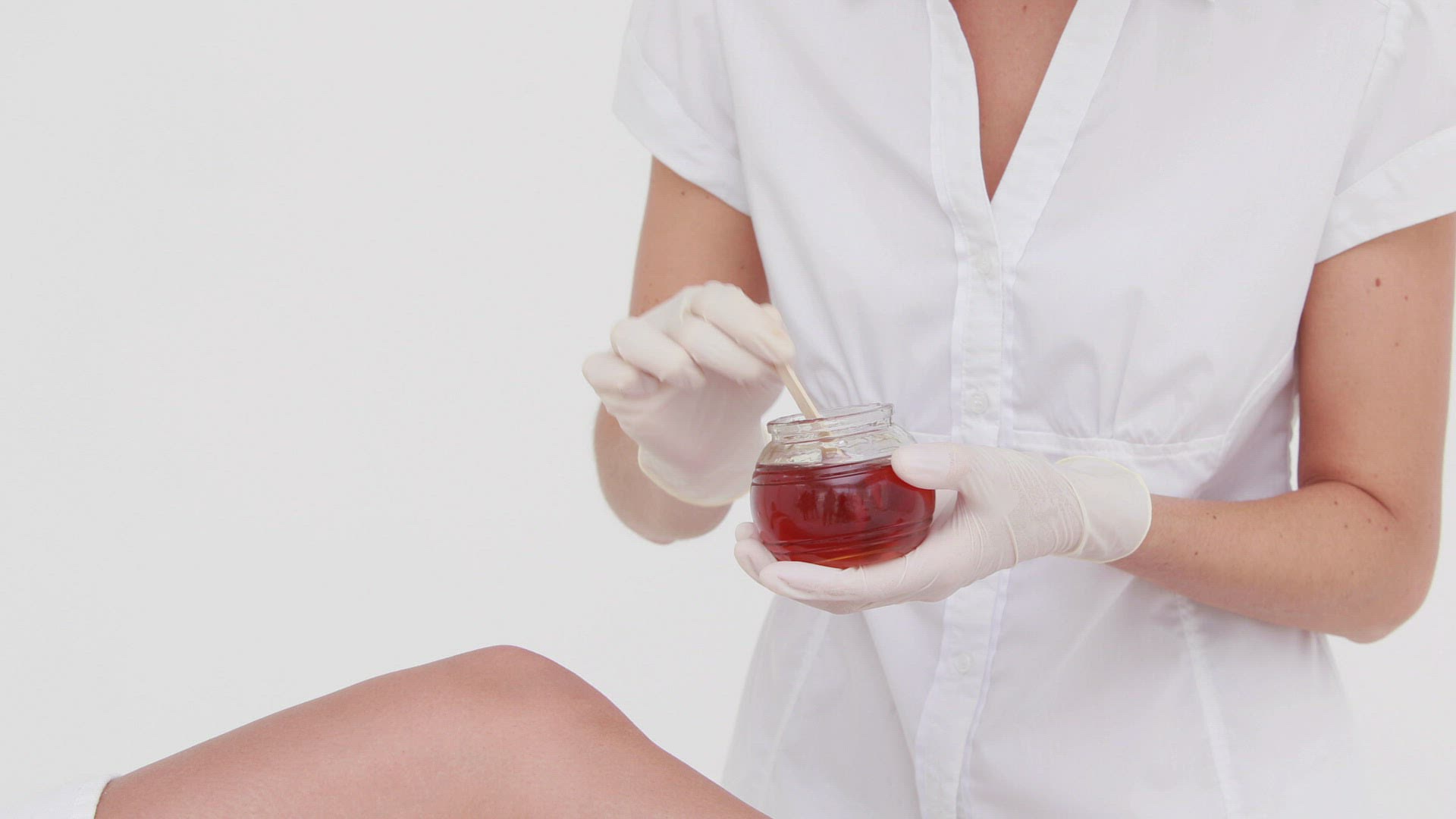 Beautician woman applying hot wax on woman legs in therapy room